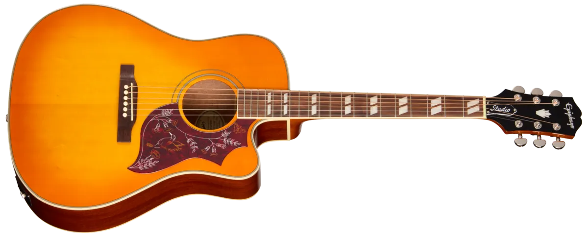 Epiphone Hummingbird Studio EC er en del av Epiphone Studio Acoustic Collection og bygger på den ikoniske Gibson Hummingbird fra 1960. Denne modellen kombinerer klassisk square shoulder dreadnought-design med cutaway og moderne elektronikk, og passer både nybegynnere og erfarne gitarister.