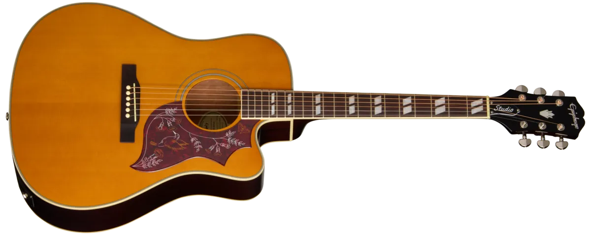 Epiphone Hummingbird Studio EC er en del av Epiphone Studio Acoustic Collection og er inspirert av den ikoniske Gibson Hummingbird fra 1960. Denne modellen kombinerer klassisk design med moderne funksjonalitet, og passer både for nybegynnere og erfarne gitarister. Den velkjente square-shoulder dreadnought-kroppen med cutaway gir enkel tilgang til de øvre båndene og gjør gitaren fleksibel både til akkordspill og mer melodisk arbeid høyere opp på halsen.