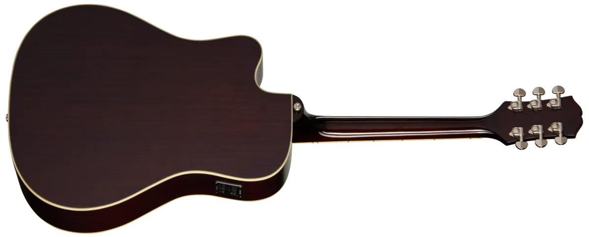 - Elektroakustisk gitar med klassisk dreadnought-klang og cutaway for bedre tilgang til høye bånd