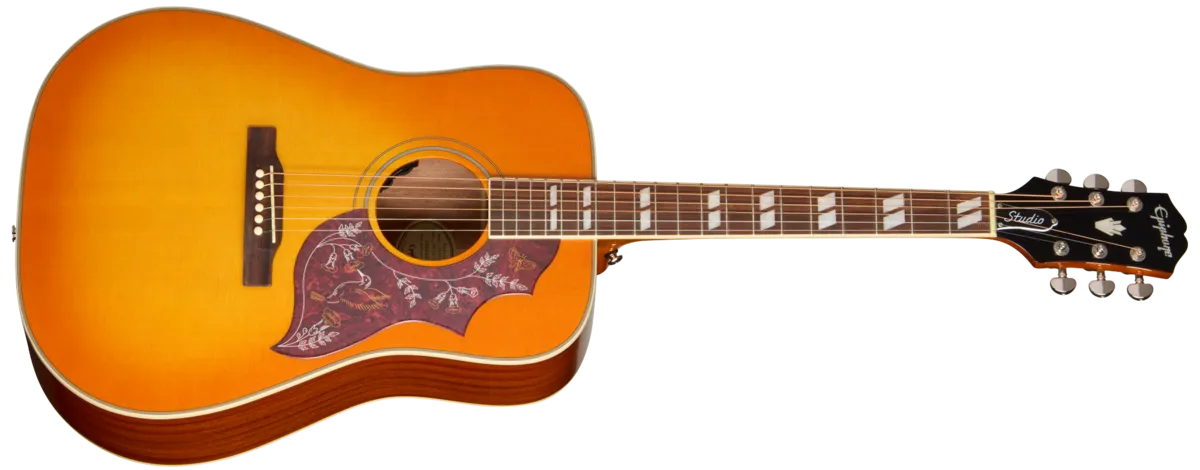 Epiphone Hummingbird Studio er en del av Epiphone Studio Acoustic Collection og er inspirert av den ikoniske Gibson Hummingbird. Modellen kombinerer klassisk square shoulder dreadnought-design med moderne funksjonalitet og passer både nybegynnere og erfarne gitarister.