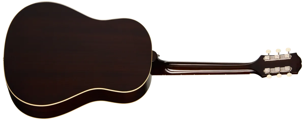 Vintage-inspirerte detaljer inkluderer tear drop-formet pickguard i mørk tortoise-stil, three-on-a-plate stemmeskruer med ivory-fargede plastknapper og 60-talls Kalamazoo-inspirert headstock med Epiphone-logo i gull.