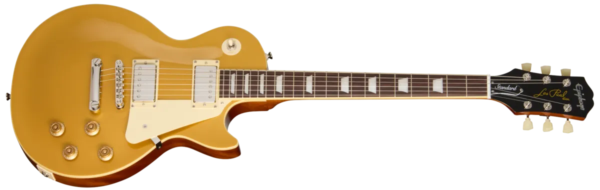 Epiphone Les Paul Standard 50s Goldtop er en klassisk elgitar inspirert av de legendariske Les Paul-modellene fra 1950-tallet. Denne modellen i Inspired by Gibson-serien gjenskaper det ikoniske utseendet, følelsen og den karakteristiske tonen som har gjort Les Paul til en av historiens mest ettertraktede gitarer.