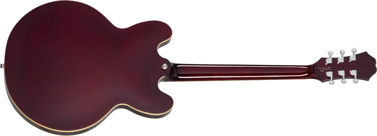 Kroppen er bygget i 5-lags laminert lønn med senterblokk i samme materiale, noe som gir semi-hollow-konstruksjonen stabilitet og kontrollert resonans. Finishen i Dark Wine Red er tett på originalmodellene fra perioden, og detaljer som korrekt “E”-logo på plekterbrettet, Crescent Bullet truss rod-cover og brun etikett i lydhullet forsterker det historiske uttrykket.