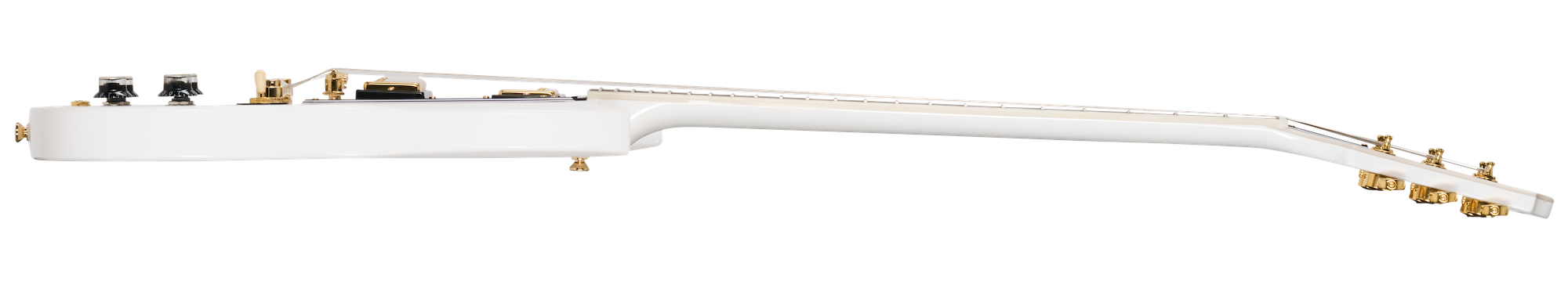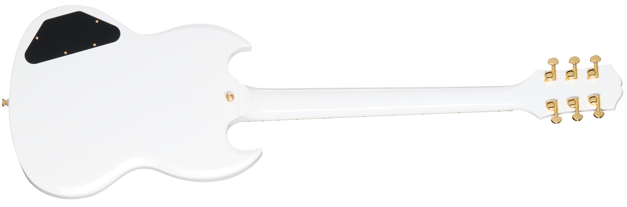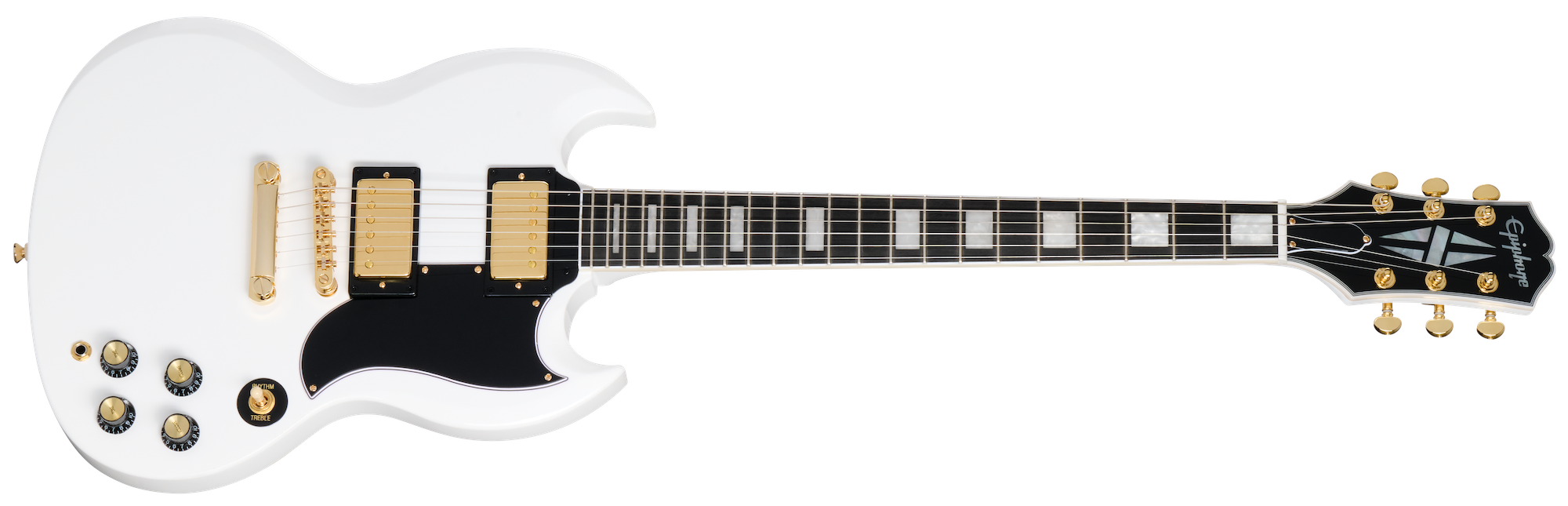 Den 12" gripebrettradiusen er komfortabel både for akkordspill i første posisjon og for bending lenger opp på halsen uten risiko for å miste tonen. Epiphone SG Custom er utstyrt med gullfarget hardware, helt ned til gullinnleggene på de sorte Top Hat-kontrollknappene. Den bundne hodestokken har Grover Mini Rotomatic-stemmeskruer og er dekorert med Epiphone-logoen og Custom Split Diamond-inlay, begge i perlemor.
