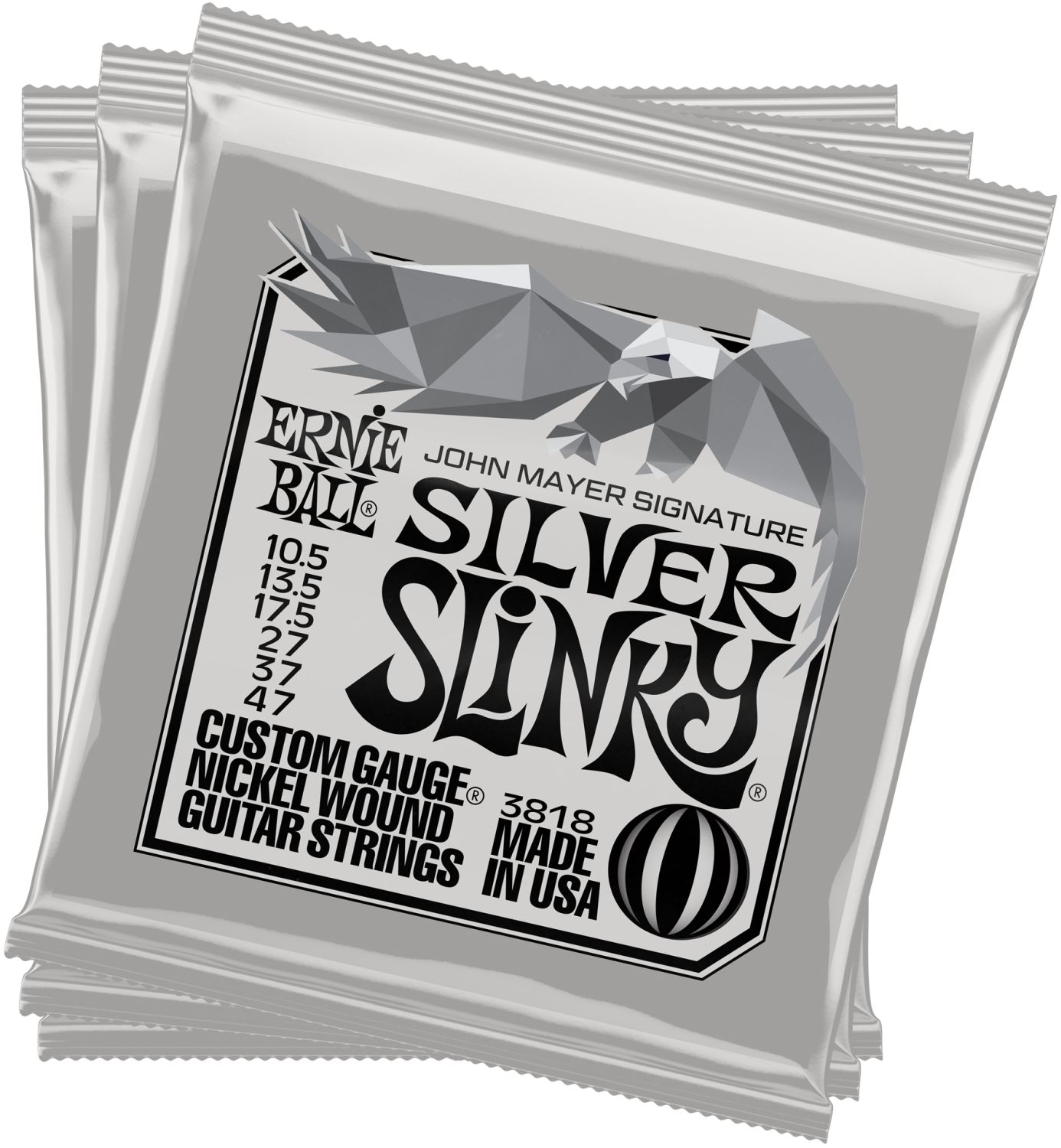 Silver Slinky-strengene er resultatet av et dypt samarbeid mellom Ernie Ball og Grammy-vinneren John Mayer. Mayer, som er kjent for sin suksessrike solokarriere og blant annet samarbeidet med tidligere Greatful Dead-medlemmer i bandet Dead & Company, er svært nøye når det kommer til kvalitet, følelse og lyd. Hver streng er derfor designet ut fra Johns eksakte ønsker når det kommer til tykkelse og hvordan strengen skal føles, alt for den perfekte tonen og følelsen. 3 sett pakket i en fin blikkboks.