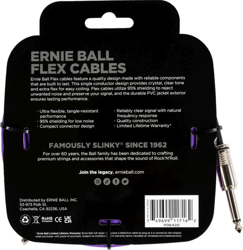 Ernie Ball Flex-instrumentkabler er designet med tone og pålitelighet i tankene. Resultatet er en kabel med en ren og ufarget tone med ekstra "flex" som gjør kabelen lett å håndtere uten å floke seg. Flex-kablene har en godt målt skjerming for å redusere uønsket interferens og opprettholde tonen i instrumentet ditt. Kablene har også en ekstra beskyttelse ved kontaktene for å øke levetiden på kablene ytterligere.