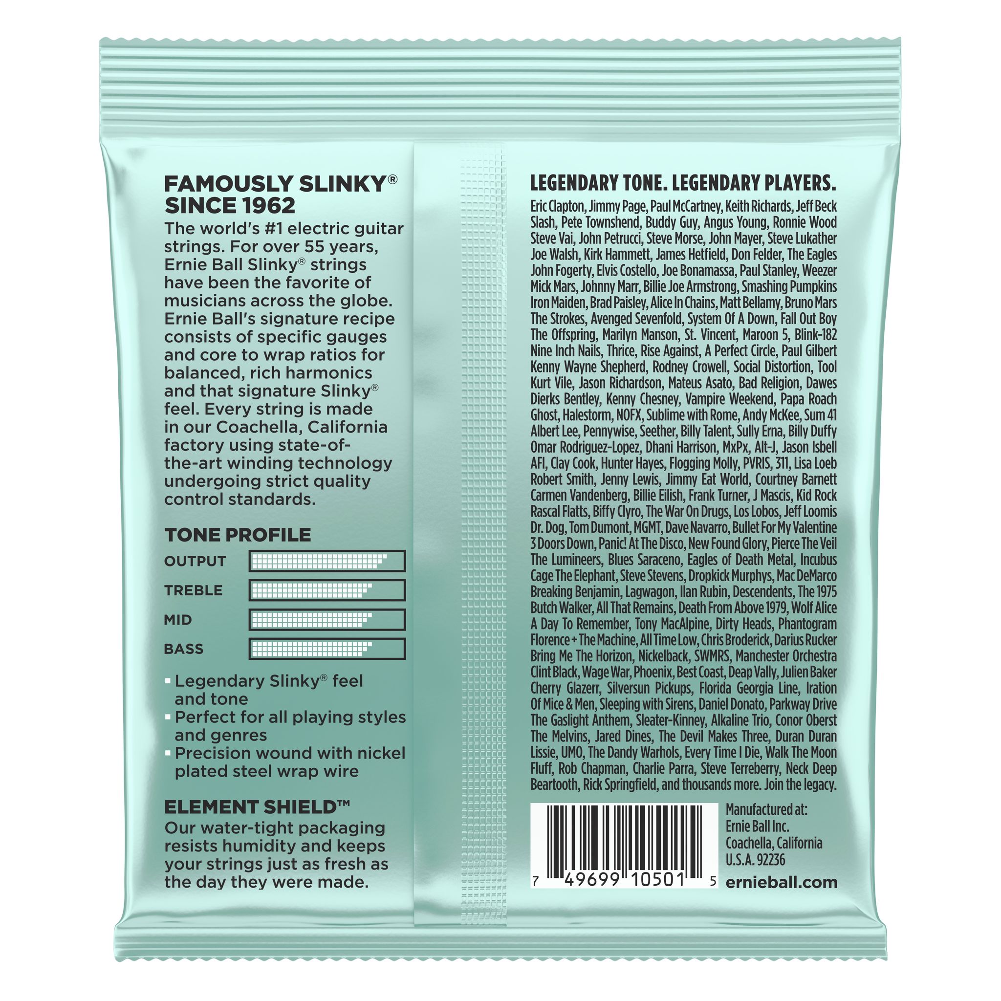 Ernie Ball Slinky Electrics er strengene som gjorde Ernie Ball kjent og de brukes av Eric Clapton, John Mayer, Steve Vai… bare for å nevne noen. Strengene lages med høyest mulige standard og presisjon for å kunne garantere tone og holdbarhet. De spunnede strengene har en hex-formet stålkjerne som spinnes med en tråd av nikkelplettert stål. De uspunnede strengene er lagd av et spesielt tinnplettert karbonstål. Lyden er velbalansert og funker for de aller fleste musikkstiler. Slinky Electric fins i en mengde utførelser og tykkelser, alt fra standard 6-strengs til 8-strengs.