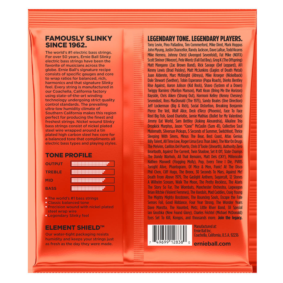 Ernie Ball Regular Slinky Bass Strings er klassisk roundwound-strenger lagd for å gi maksimal klarhet og en bra porsjon output. Kjernen er av beste kvalitet stål og er spunnet med en nikkelplettert ståltråd. Disse strengene passer de fleste musikkstiler og listen med artister som bruker disse kan gjøres lang.