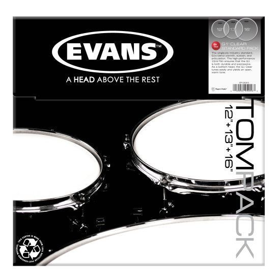 Evans Tom-Pack ETP-G1CLR-S. Pakke med Clear G1 tom-tom skinn. Standard inneholder: 1 x 12 , 1 x 13 , 1 x 16 . G1 er et 1-lagsskinn som gir deg hele lydpalletten og muligheten til å fremheve et bredt lydregister fra trommesettet. Skinnene reagerer på den minste nyanse og har den mest holdbare coatingen på markedet, som gir en varm og åpen lyd med god kontroll på overtonene. Tilgjengelig både i Clear og Coated.