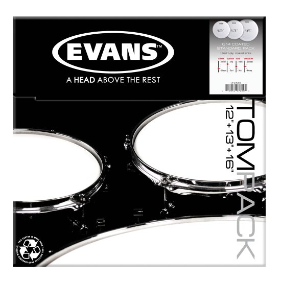 Evans Tom-Pack ETP-G14CTD-S. Pakke med Coated G14 tom-tom skinn. Standard inneholder: 1 x 12 , 1 x 13 , 1 x 16 . G14 er Evans tykkeste 1-lagsskinn av 14mil film, for skarptromme og toms, og et spennende alternativ til 2-lagsskinn. G14 har samme fulle bunn, men med tydeligere attakk. G14 skinnene har en relativt kort sustain og fokusert tone med relativt få overtoner og en bærekraft som gjør at G14 fungerer ypperlig lavt stemt. På skarptrommen leverer G14 sugende og fet lyd lavt stemt. Stabiliteten og Level 360 designet gir tone allerede ved fingerstemming. G14 fungerer like bra høyt stemt og leverer sentrert og dyp lyd med en forbløffende dynamikk og et bra attakk uten at spillefølelsen blir stum. Evans G14 er et ekstra slitesterkt 1-lagsskinn og blir derfor et alternativ for de som har vokst ut av 2-lags skinnets hengekøye EQ, men som ikke vil ofre det kraftige spillet. Tilgjengelig i Clear og Coated.