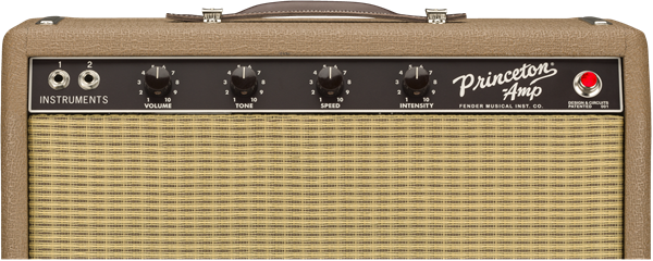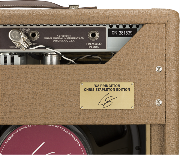 The brown ’62 Princeton amp’s sensitivity and smooth organic tremolo made it a longtime studio favorite and the ideal partner for Grammy®-winning country artist, Chris Stapleton. The hand-wired ’62 Princeton Chris Stapleton Edition combines the classic 6G2 circuit with Stapleton’s favorite features and personally chosen aesthetic touches. This 12W combo features Fender Vintage “Blue” tone caps, Schumacher™ transformers, an upgraded Eminence® 12” Special Design “CS” speaker, and an output tube-biased tremolo circuit. The acoustically resonant solid pine cabinet wears rough brown textured vinyl covering, wheat grille cloth and thick dark brown leather handle, while the dark brown control panel sports dark brown “radio” knobs and the rear panel features an engraved brass plate with Chris Stapleton's signature. Includes 1-button switch for tremolo and retro-styled Filson™ Rugged Twill fabric cover.