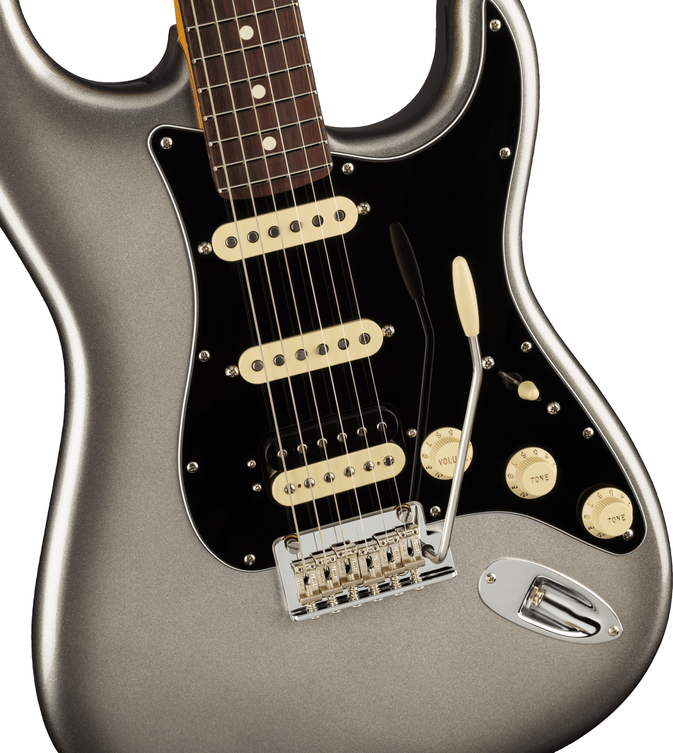 • Bridge: 2-Point Synchronized Tremolo with Bent Steel Saddles, Pop-In Tremolo Arm and Cold-Rolled Steel Block