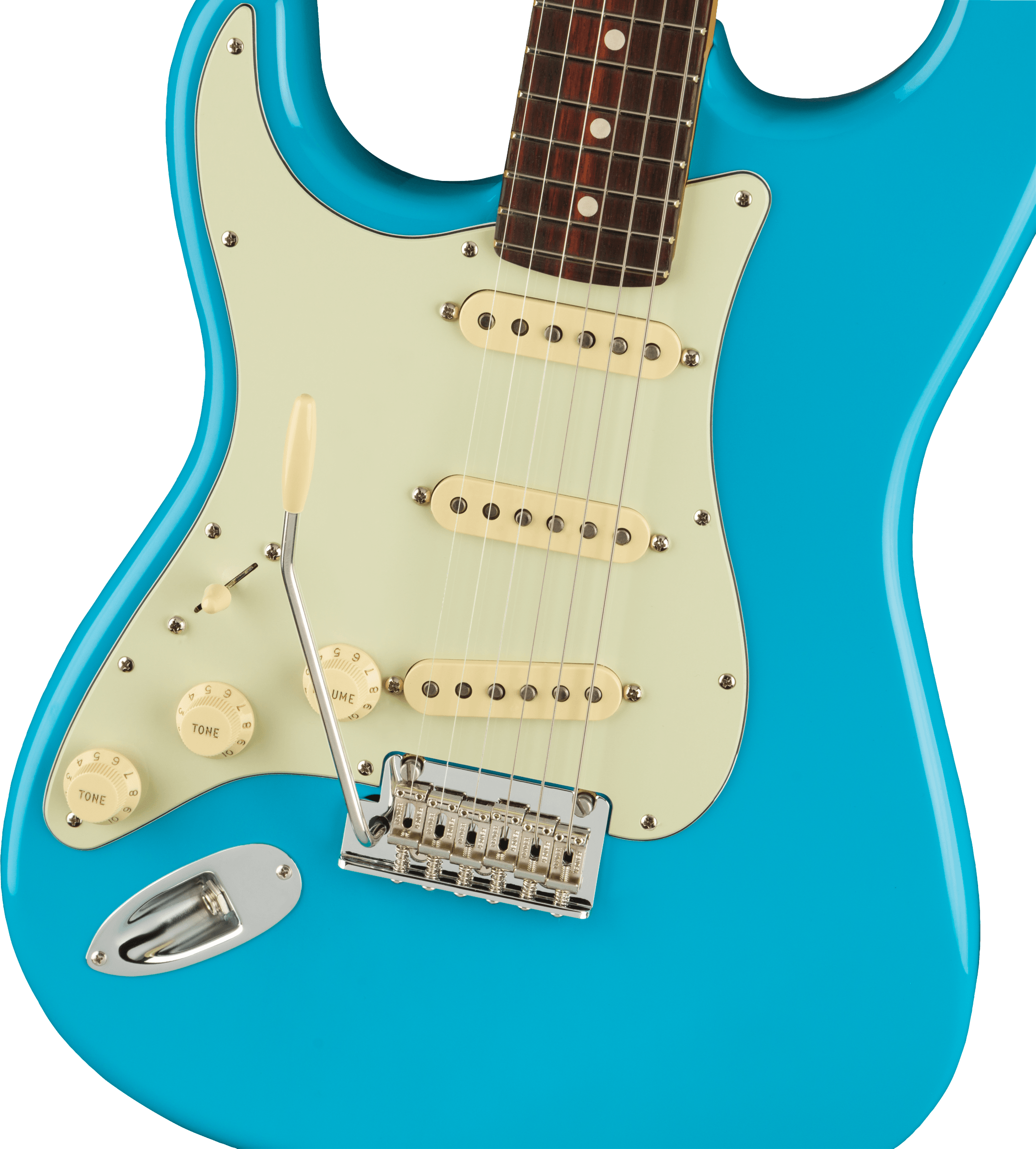Our popular Deep “C” neck now sports smooth rolled fingerboard edges, a “Super-Natural” satin finish and a newly sculpted neck heel for a supremely comfortable feel and easy access to the upper register. New V-Mod II Stratocaster single-coil pickups are more articulate than ever while retaining bell-like chime and warmth. An upgraded 2-point tremolo with a cold-rolled steel block increases sustain, clarity and high-end sparkle.