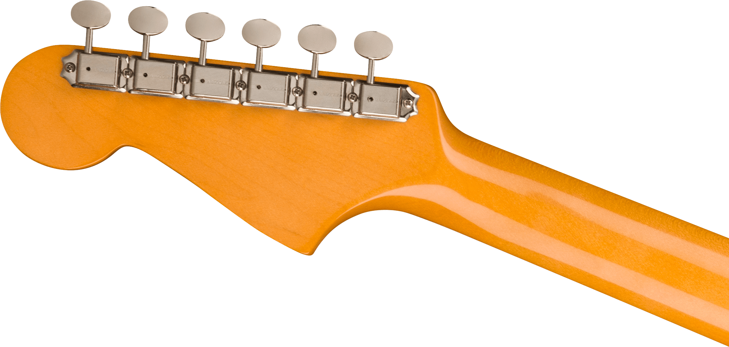 The American Vintage II 1966 Jazzmaster features a comfortable “C” shape maple neck that plays like a dream with a 7.25” radius round-lam rosewood fingerboard and vintage tall frets. Characteristic of production in 1966, this guitar is offered with white neck binding, pearl blocks, single-line “Fender Deluxe” tuners and matching painted headstock (on custom colors only). The patented “floating” tremolo, adjustable bridge with threaded saddles and Pure Vintage ‘66 Jazzmaster pickups, wired to the signature rhythm and lead circuits, deliver classic tone and authentic Fender feel.