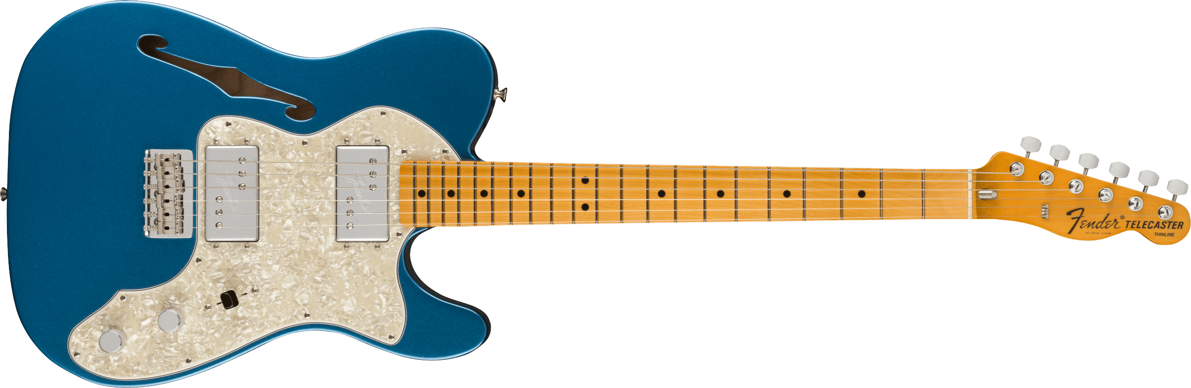 Featuring a “C”-shape hard rock maple neck, the American Vintage II 1972 Telecaster Thinline plays like a dream with a 7.25” radius fingerboard and vintage tall frets. To create authentic Wide-Range humbucking pickups, we resurrected CuNiFe magnets, an essential element in recreating the sonics of the originals. Characteristic of production in 1972, this Thinline is outfitted with a convenient "Bullet" style truss rod nut, three-bolt neck plate with Micro-Tilt™ mechanism, “F” stamped tuners, 6-saddle string-through body hardtail with bent steel saddles and offered in Aged Natural, 3-Color Sunburst, and Lake Placid Blue over a semi-hollow ash body.