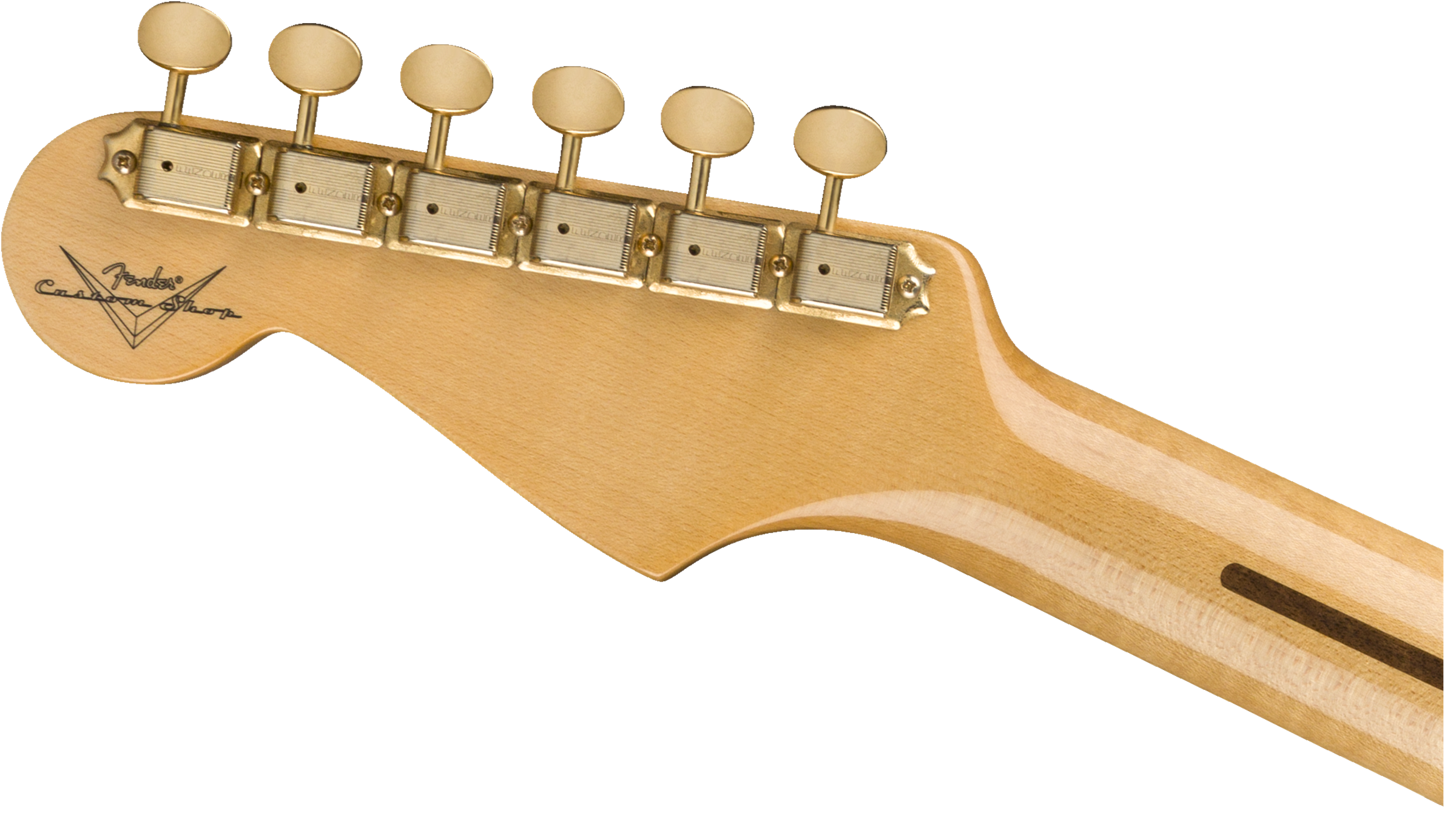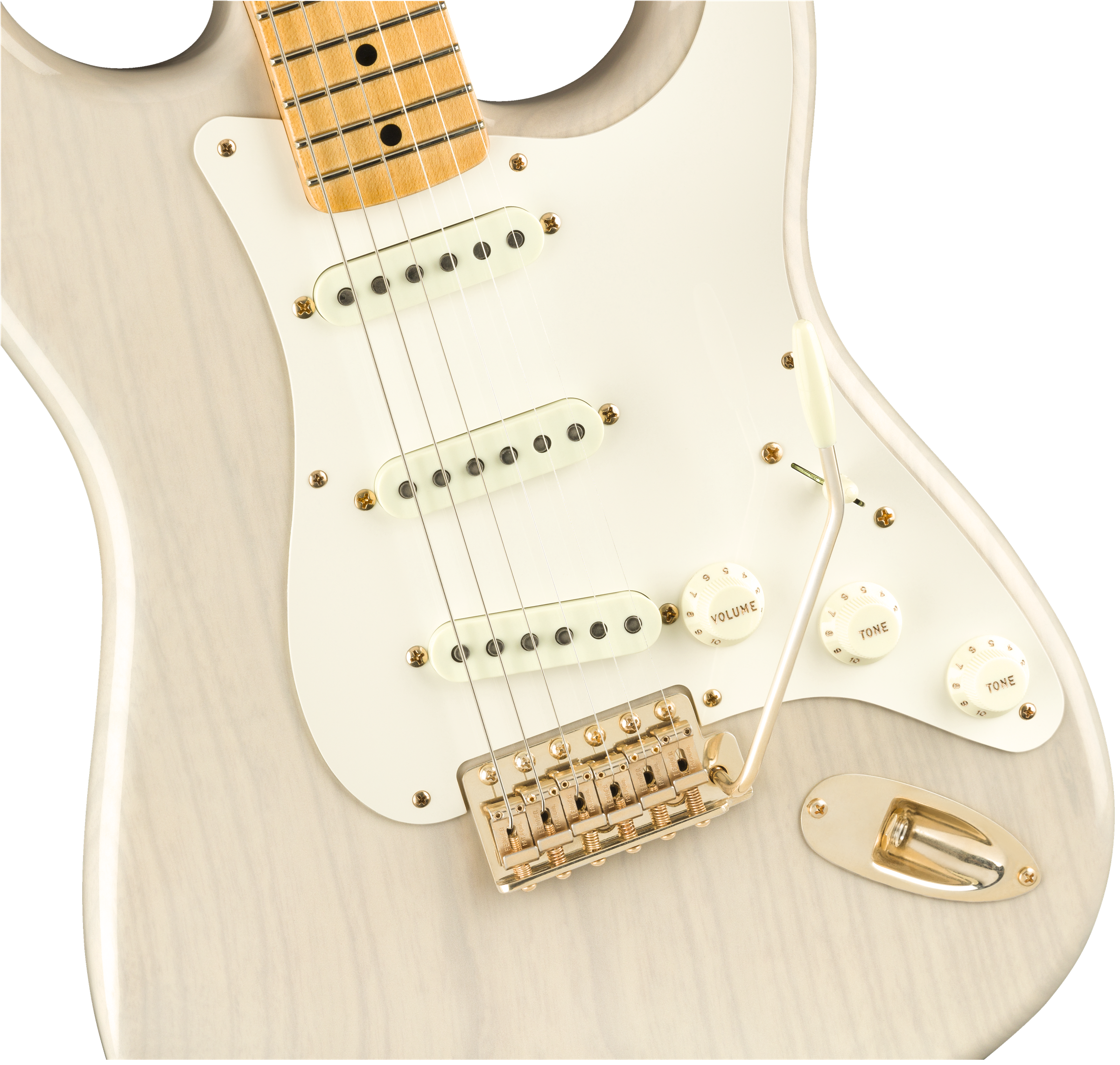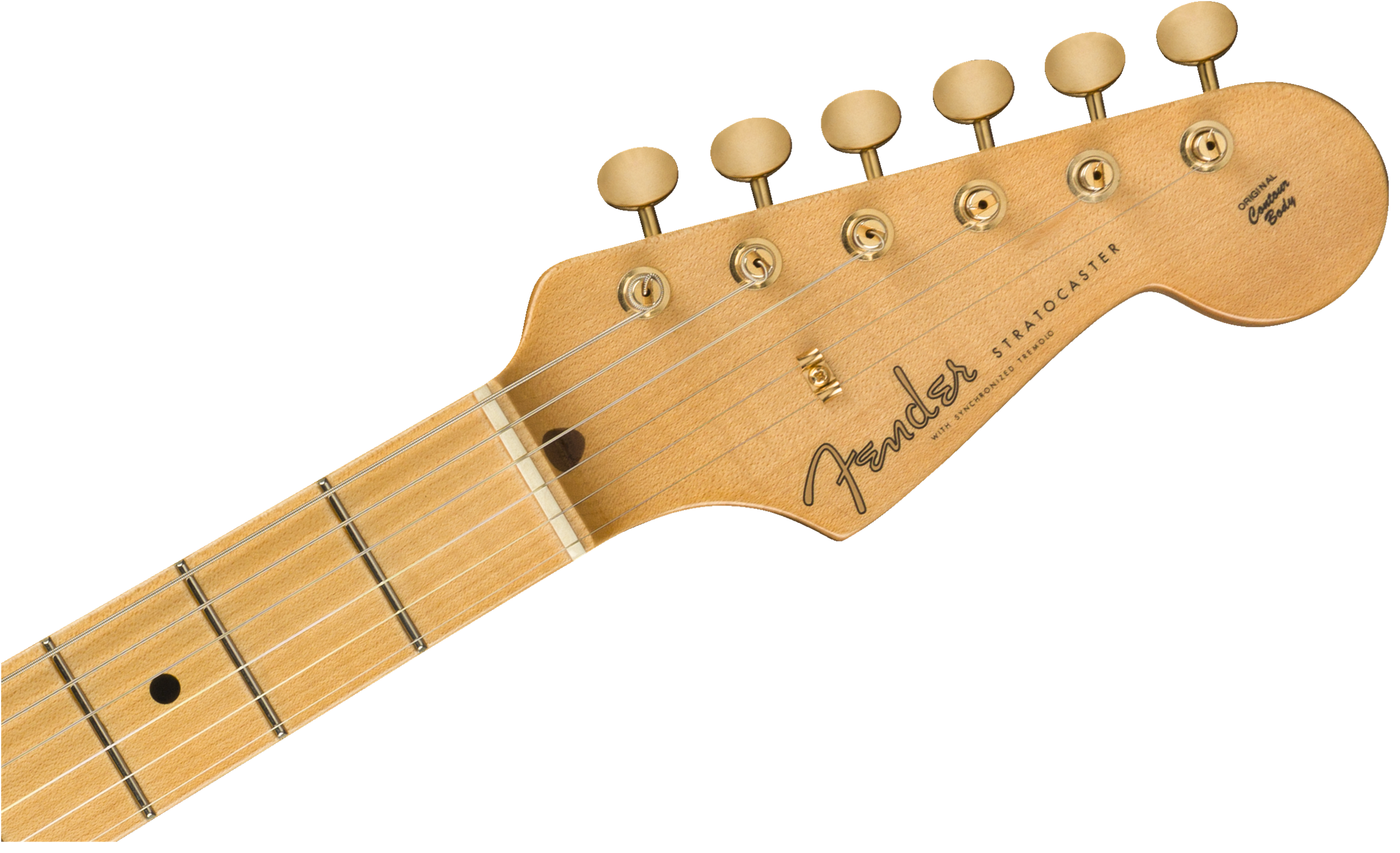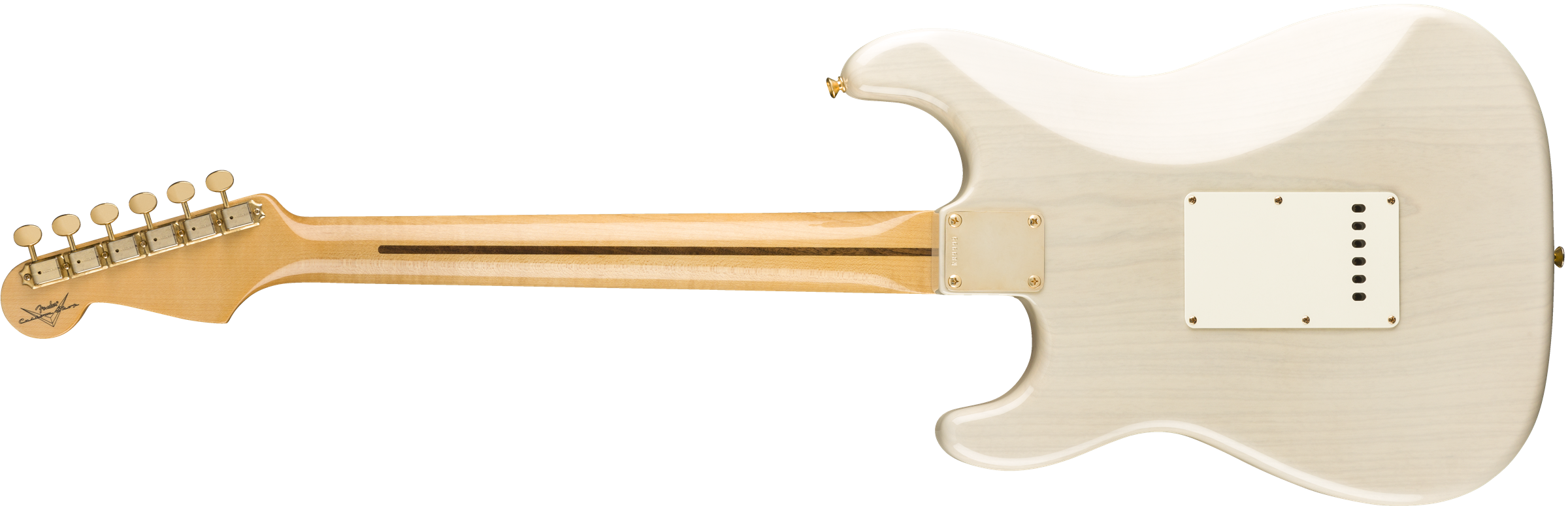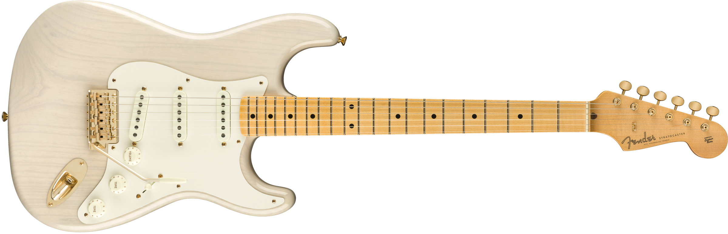One of the earliest versions of Fender’s custom work was the guitar that became known as the “Mary Kaye”. Combining a White Blonde finish with gold hardware, this guitar was featured in several ads and eventually became one of the most-desired Stratocaster models. The Vintage Custom ’57 Strat is your chance to enjoy this elegant-looking guitar that looks, sounds and feels like it’s straight from the ‘50s. The one-piece ash body sports an immaculate NOS flash coat lacquer finish that lets the wood breathe with more sustain, while wearing in a distinctly personal way. The tinted riftsawn maple sports a “ ’57 V” profile, while the maple fingerboard’s vintage-style 7.25”-9.5” compound radius is ideal for playing chords or single-note lines. A trio of Hand-Wound ’57 Strat single-coil pickups, connected with vintage-style wiring, offers authentic original-era tone that lit the music world on fire.