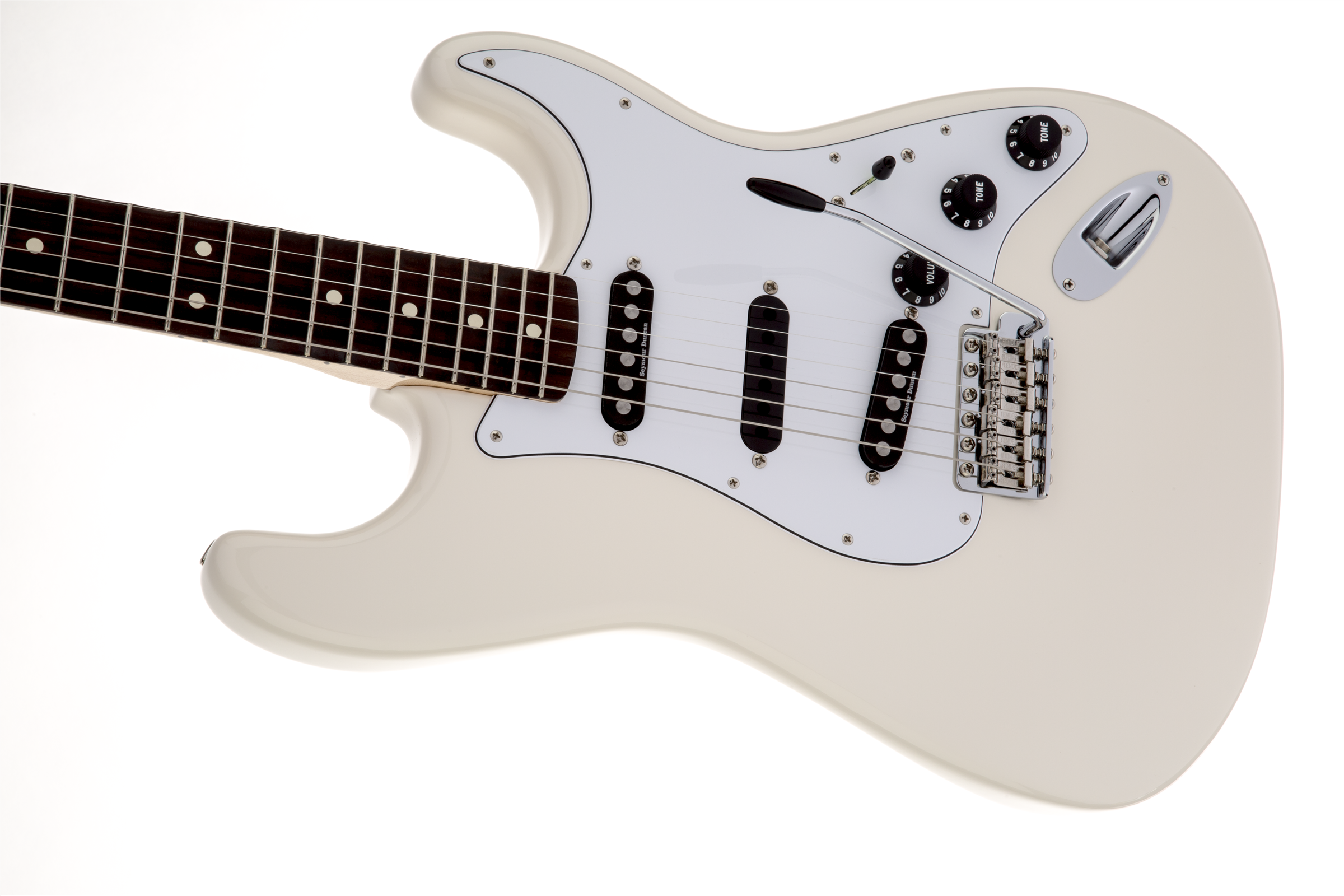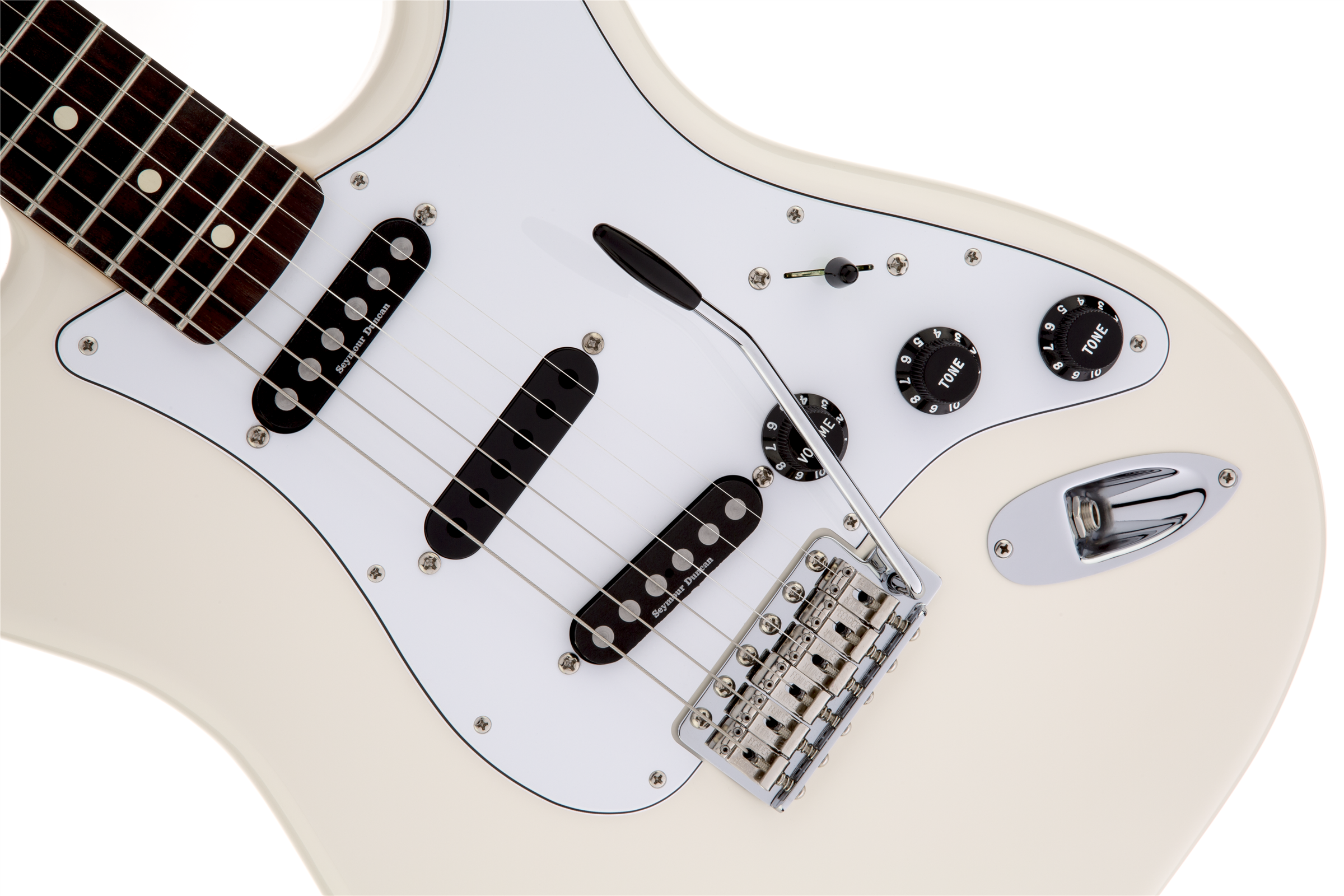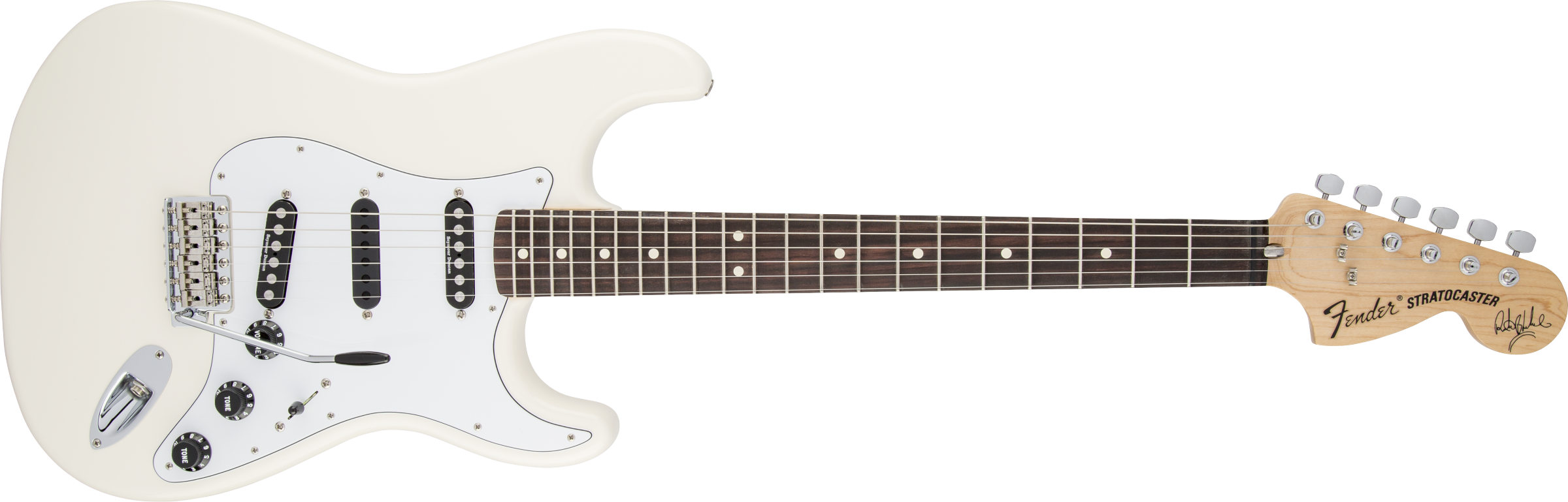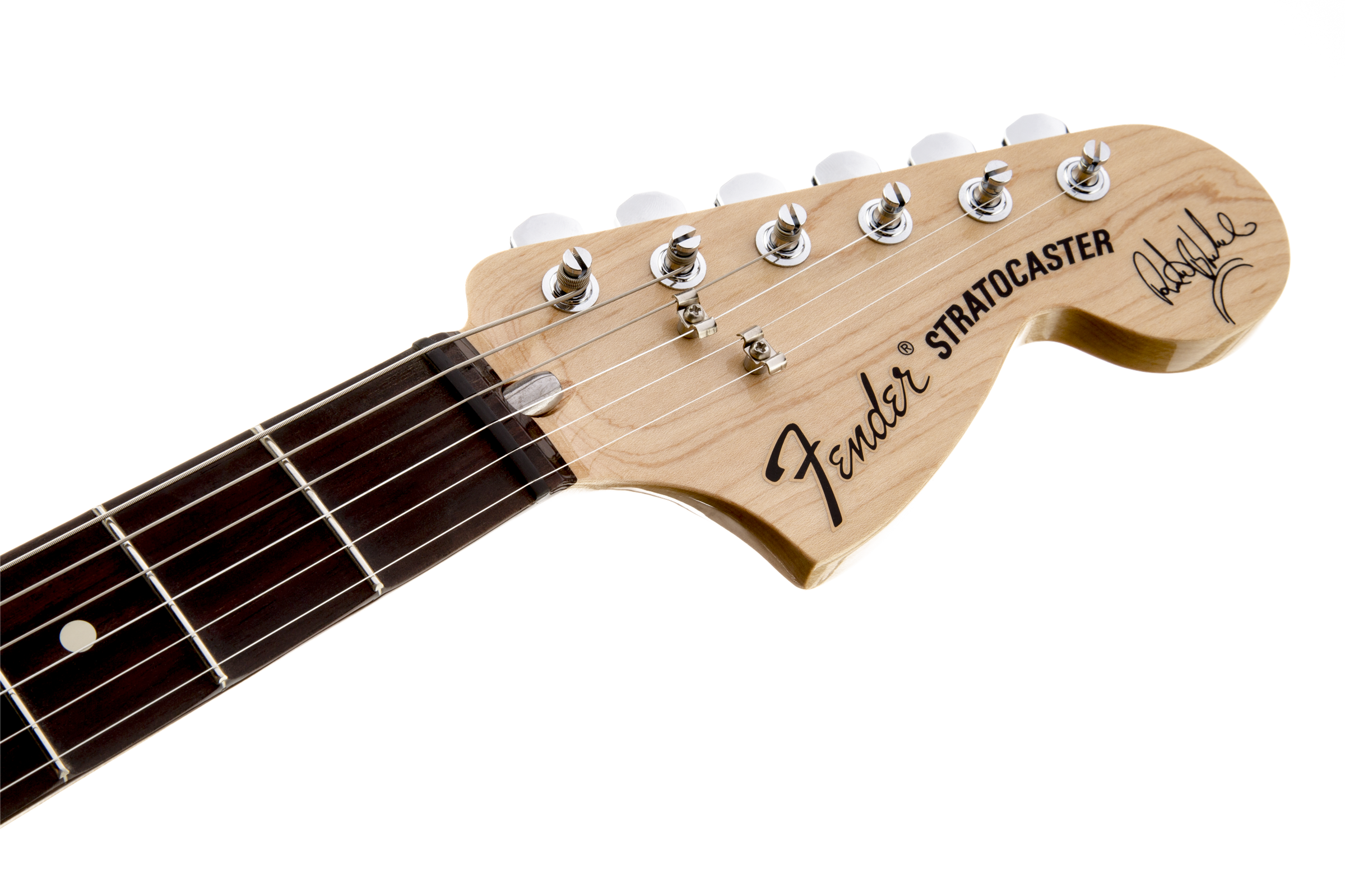 • Unique Features: Graduated Scalloped Rosewood Fingerboard, Ritchie Blackmore Signature on Front of Headstock, Flush Mounted Dunlop®; Straplocks, Large '70s Style Headstock, '70s Style Decal, Bullet Truss Rod Adjustment Nut, 3-Bolt Neck Plate with Micro-Tilt™; Neck Adjustment, Pearloid Dot Position Inlays, Black Plastic Knobs, Pickup Covers, Tremolo and Switch Tips, Synthetic Bone Nut