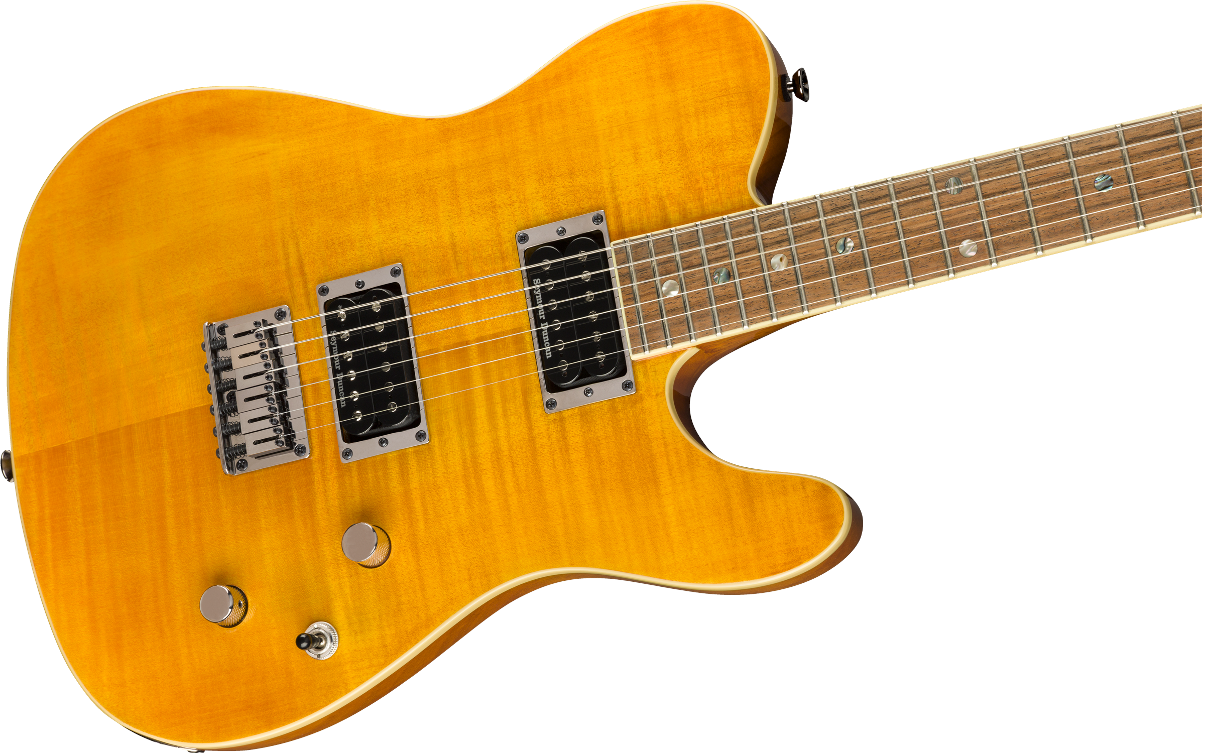 An exquisite high-end Telecaster experience awaits the player who gets his hands on a Special Edition Custom Telecaster FMT HH. First, it looks phenomenal, with a carved flame maple top on a mahogany body, cream body binding, a gorgeous Amber finish with a matching headstock, a mahogany set neck, abalone dot fingerboard inlays and black hardware. Second, it sounds phenomenal, with dual Seymour Duncan® humbucking pickups, three-way pickup switching, a push/pull coil tap switch built into the master tone control knob, and more. A decidedly non-traditional Telecaster of peerlessly crafted style and powerful sonic substance.
