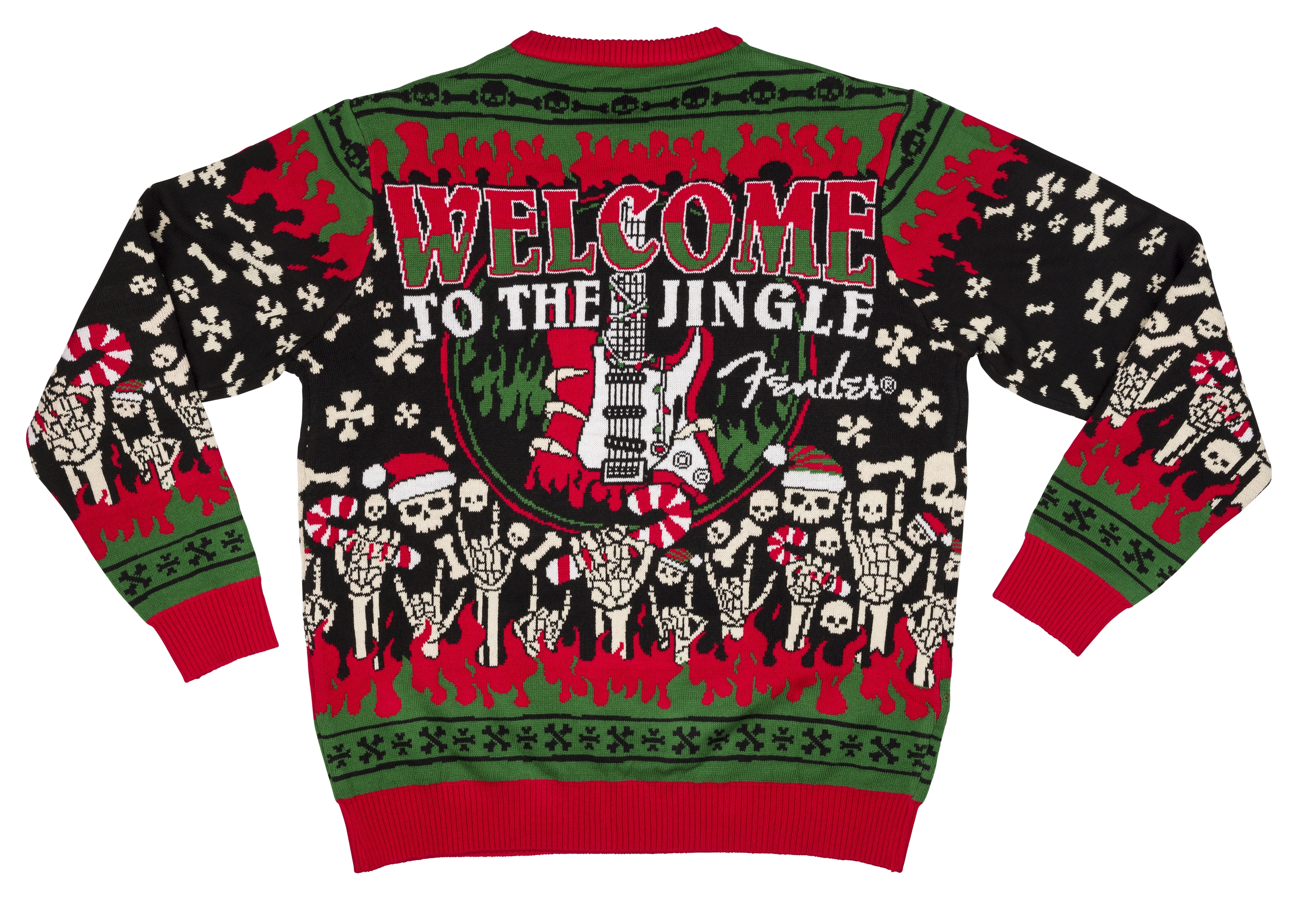 Fenders "Welcome to the Jingle" Ugly Christmas Sweater vil bli høydepunktet på din neste julefest, familiegathering eller gaveutveksling. Fenders komfortable flerfargede genser vil være samtaleemnet på alle dine julearrangementer. Du vil garantert vinne den neste Ugly Christmas Sweater-konkurransen i din nye "Welcome to the Jingle" genser og lue. Rock On til alle dere julealver. Åh, så moro det er å feste med Fender!!