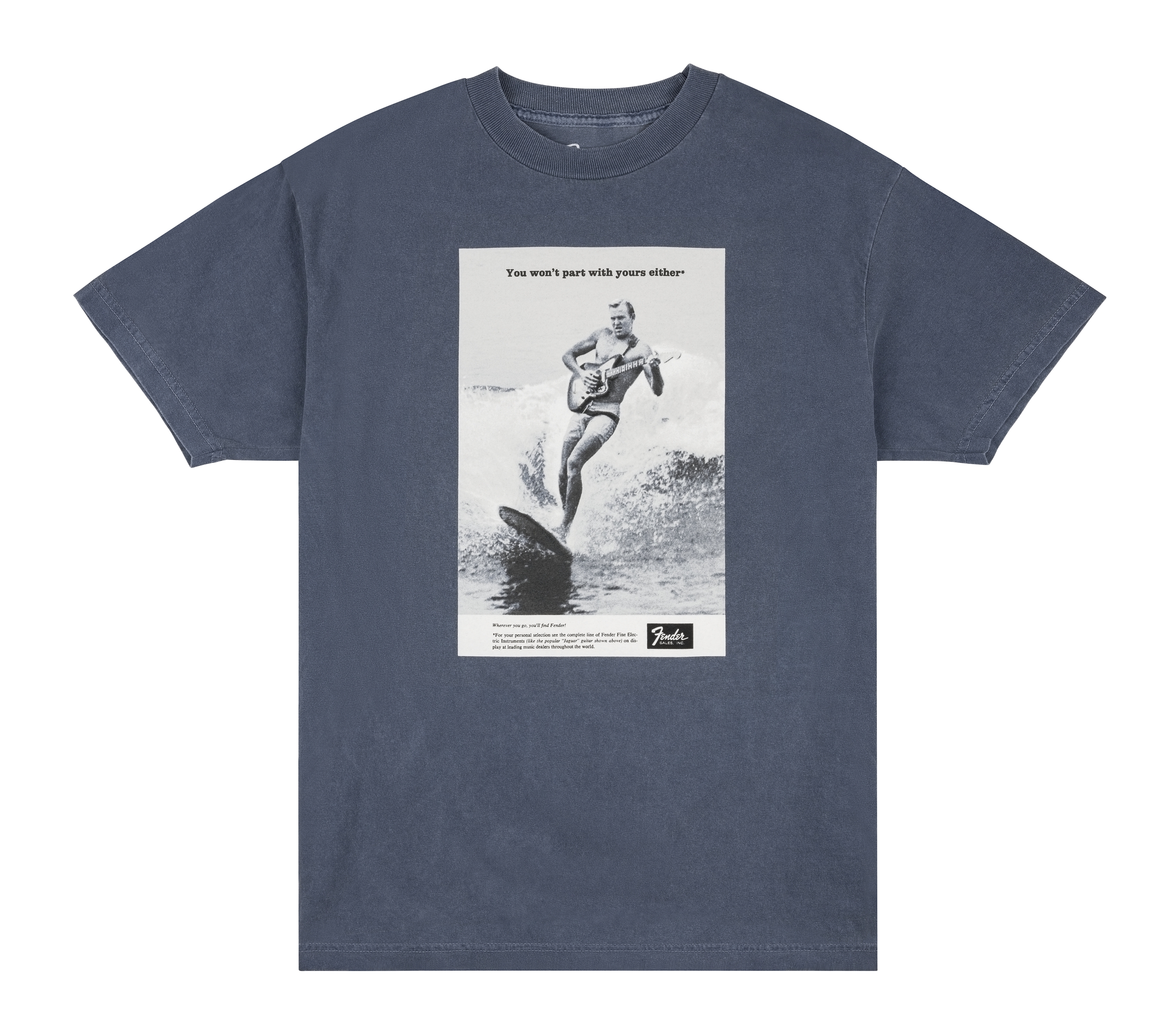 Lansert i 1960 var Fenders kampanje, "You won't part with yours either" rettet mot gitarspillere som setter pris på sine Fender-gitarer og den dype følelsesmessige forbindelsen musikere ofte utvikler med instrumentene sine. Bli en del av Fenders historie ved å bære din ocean blue T-skjorte med surfer-grafikk fra denne ikoniske vintage-reklamen. Surfs Up!!