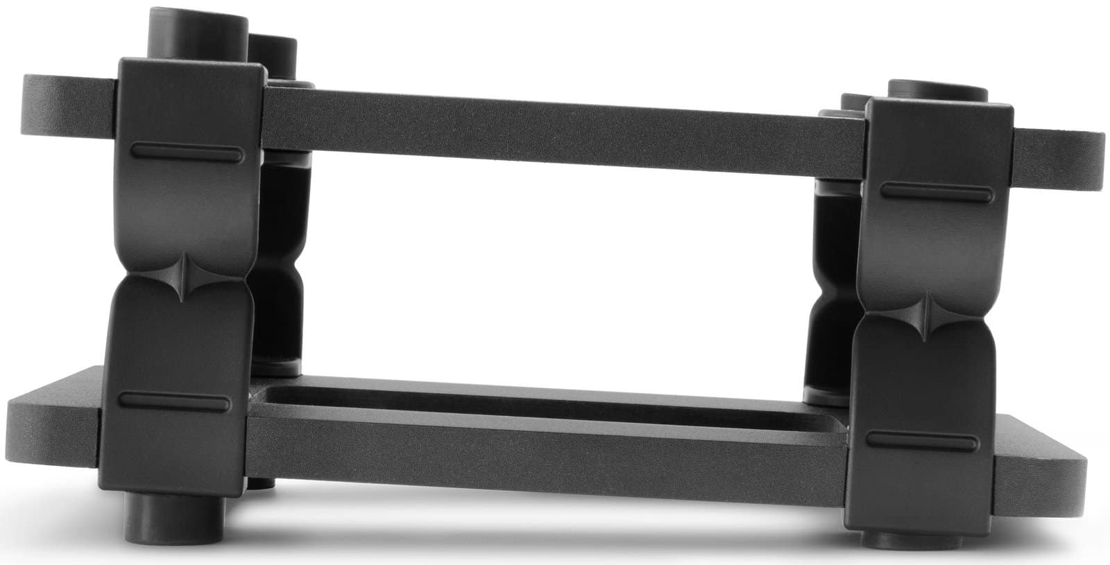 Made from MDF wood (the same material as your monitor enclosures) they are rugged and acoustically well damped. The stand “posts” are made with polypropylene, minimizing the “ringing” sound of ABS plastic. Both top and bottom of the stands are capped off with extremely absorbent, 40 durometer rubber feet. The result of the stand construction allows your monitors to “breathe” and to produce much purer tones and a less distorted midrange.
