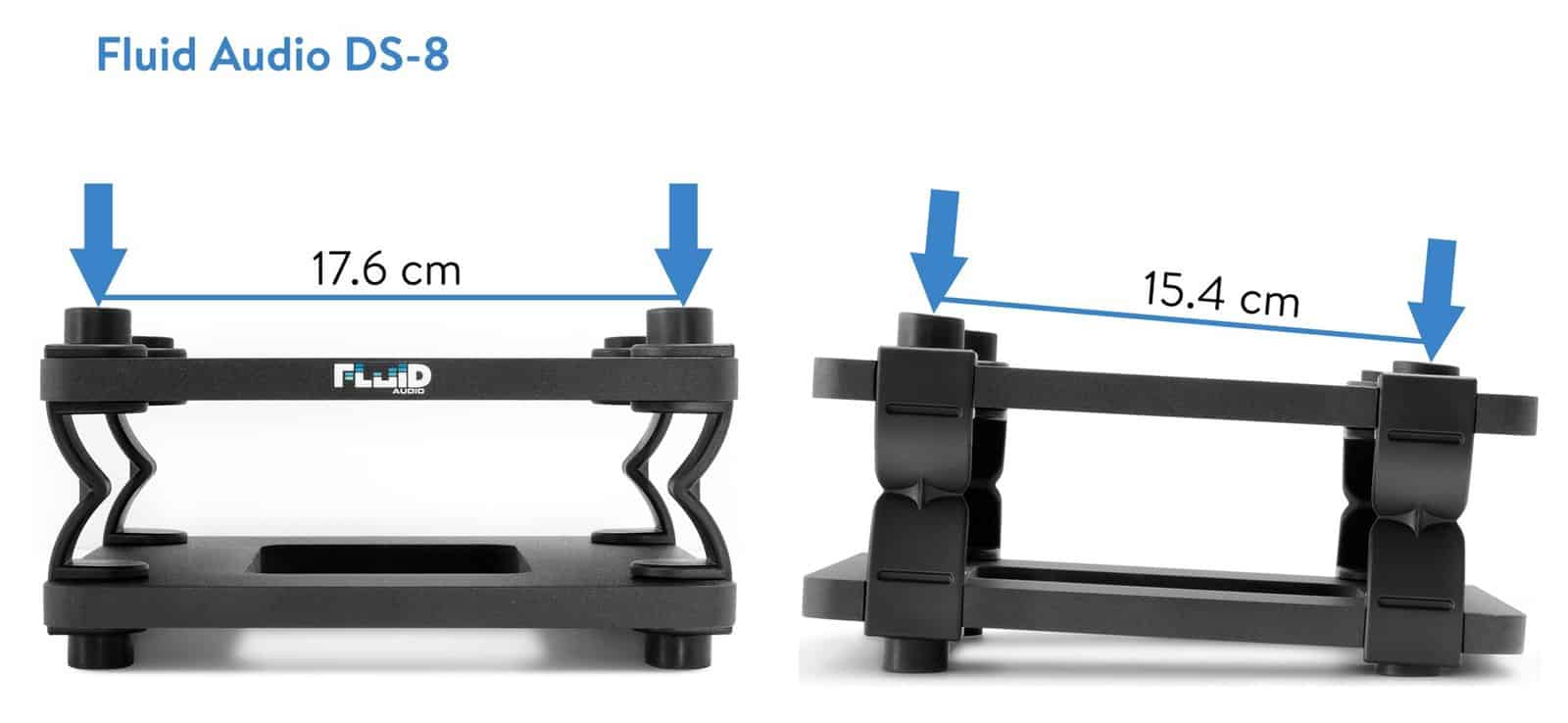 The Fluid Audio DS8 desktop monitor stands are designed for use with all 7” and 8” 2-way studio monitors. They come with the ability to elevate your monitors to two heights: 3” and 6”. With the included rubber feet, the stands become an acoustic isolation system that can adjust to 3 angles: Flat, 3 and 6 degrees of tilt.