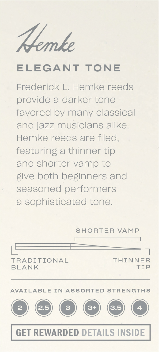 Frederick L. Hemke rørene gir den mørke tonen som mange klassise- og jazzsaxofonister foretrekker. Designen passer spesiellt bra for tradisjonelle munnstykker med rundere kammer. Franskslipte, for bedre respons i de lavere registre og ekstra klarhet i tonen, gjør også myke attakk lettere. Et profesjonellt rør i Premium kvalitet, designet av en proff.