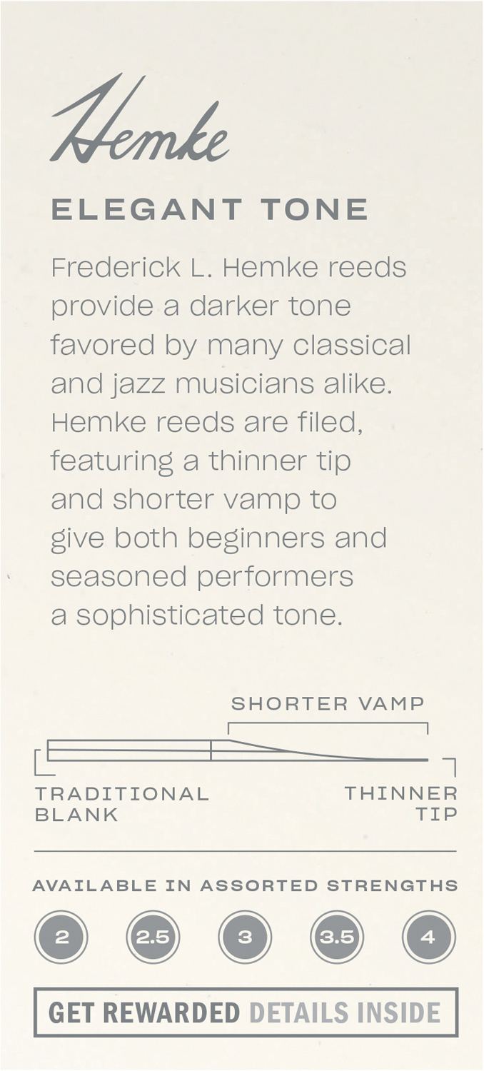 Frederick L. Hemke rørene gir den mørke tonen som mange klassise- og jazzsaxofonister foretrekker. Designen passer spesiellt bra for tradisjonelle munnstykker med rundere kammer. Franskslipte, for bedre respons i de lavere registre og ekstra klarhet i tonen, gjør også myke attakk lettere. Et profesjonellt rør i Premium kvalitet, designet av en proff.