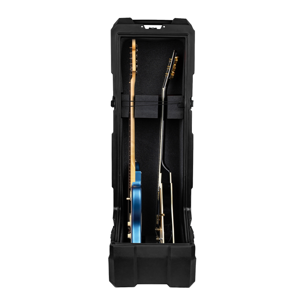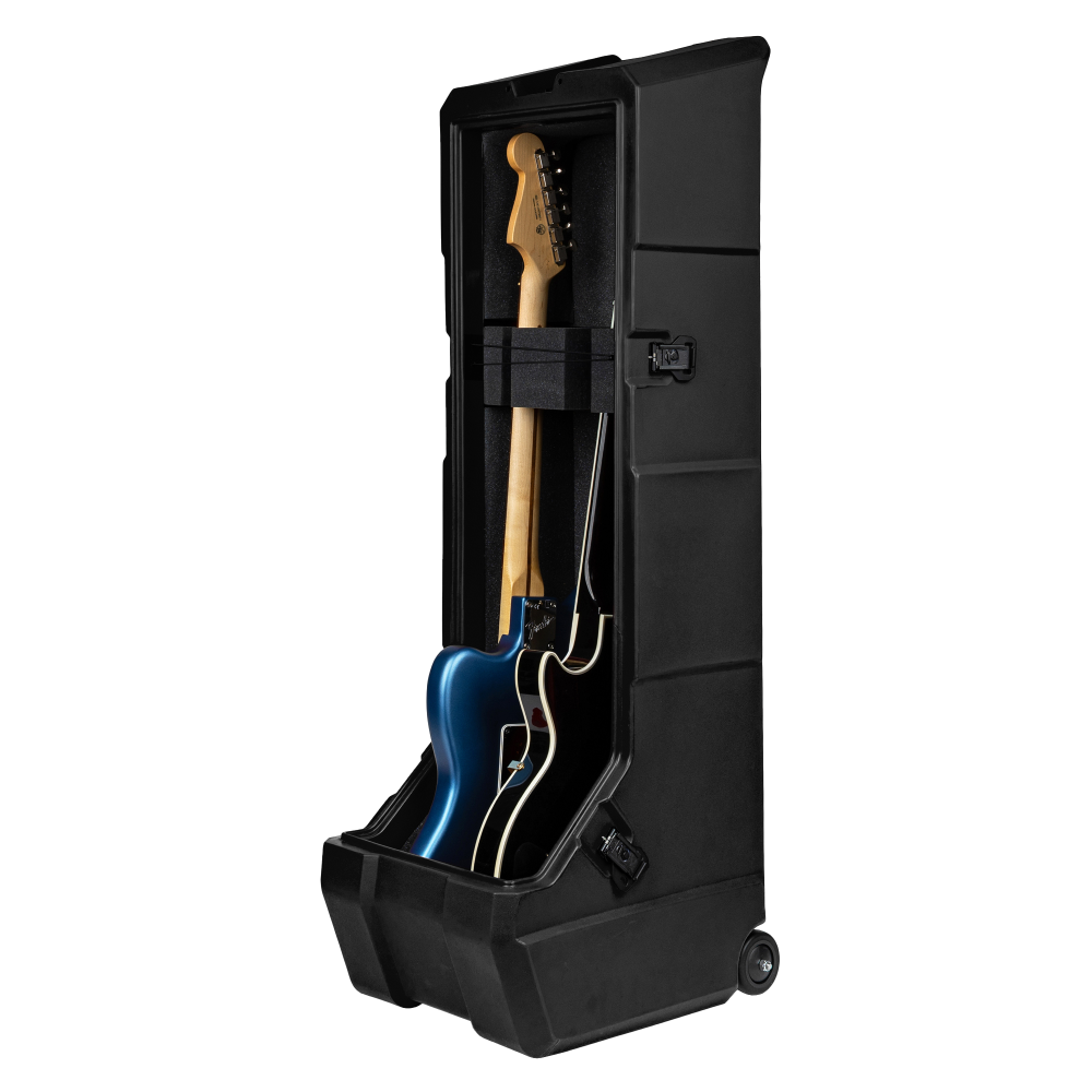 Gator Cases Mini Vault er en slitesterk og kompakt kasse designet for trygg oppbevaring og transport av to elektriske gitarer. Perfekt for turnerende musikere, med et rotasjonsstøpt skall i polyetylen og tykke skumvegger som gir solid beskyttelse.