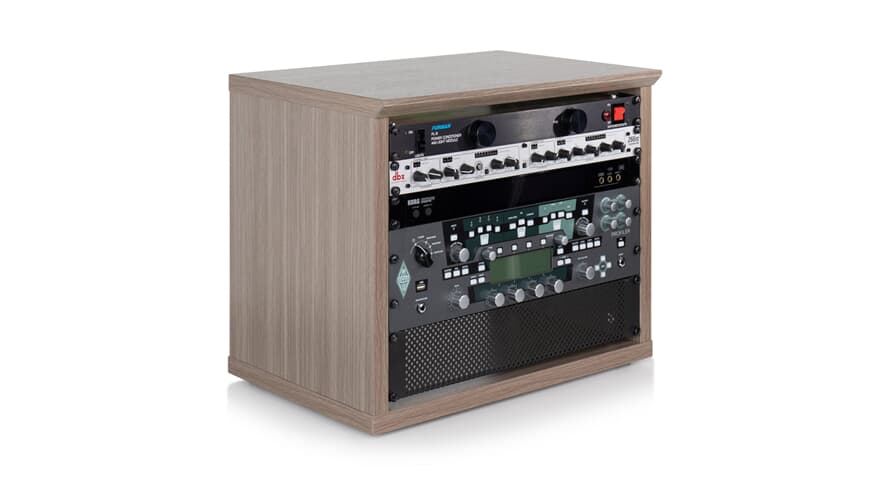 Elite Furniture Series 8U desktop studio rack i grå finish - 8U rack med plass til audio-utstyr i stabil kryssfinerkonstruksjon.
