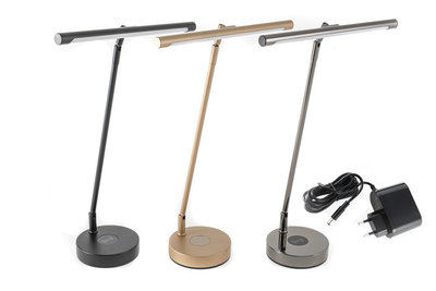 Touch sensitive sensors on lamp head (On/Off, dimmer function and colour temperature setting) 78 energy-saving LEDs Colour temperature adjustable: 3000 K - 6500 K Dimmable, on and off illuminance at 30 cm distance: 1200 lux Light output: 5 W Power of the wireless charging unit: 10 W USB charging socket: 5V, 1.5 A Total power consumption: 23.5 W Material: Aluminium 12V 2 A power supply unit included