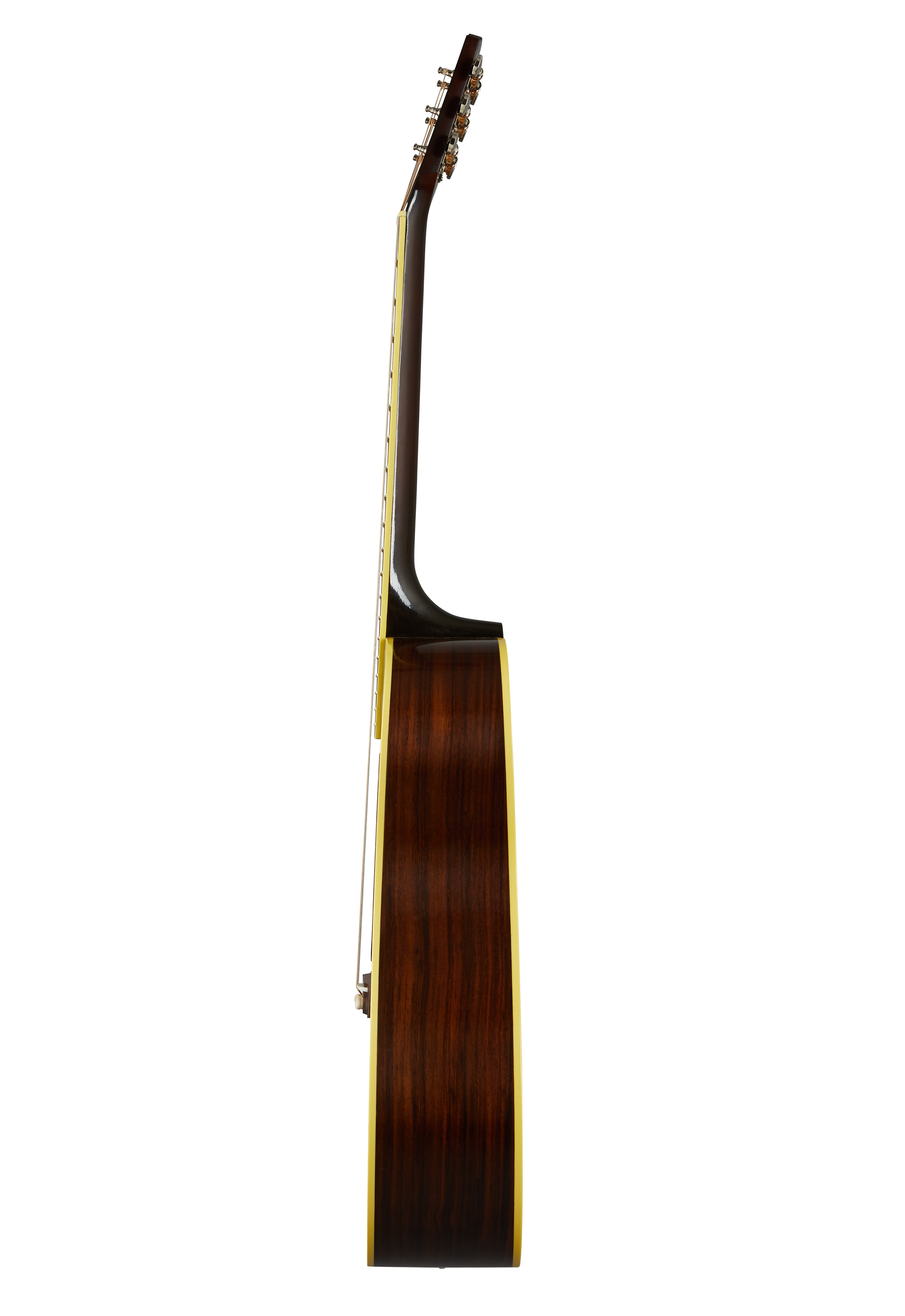 During a time when cultural optimism was low, Gibson dreamed up a new line of "advanced" instruments; included in those models was the Advanced Jumbo. Due to low production numbers from 1936-1939, this model largely flew under the radar even though it was a supreme sounding and performing instrument. The Gibson Acoustic Custom Shop is pleased to once again offer the Gibson 1936 Advanced Jumbo, oufittted with a Thermally Aged Adirondack red spruce top, rosewood back and sides, and premium Waverly tuners. The 1936 Advanced Jumbo brings back all the tone and prestige that made these such a sought-after instrument by artist and collectors.