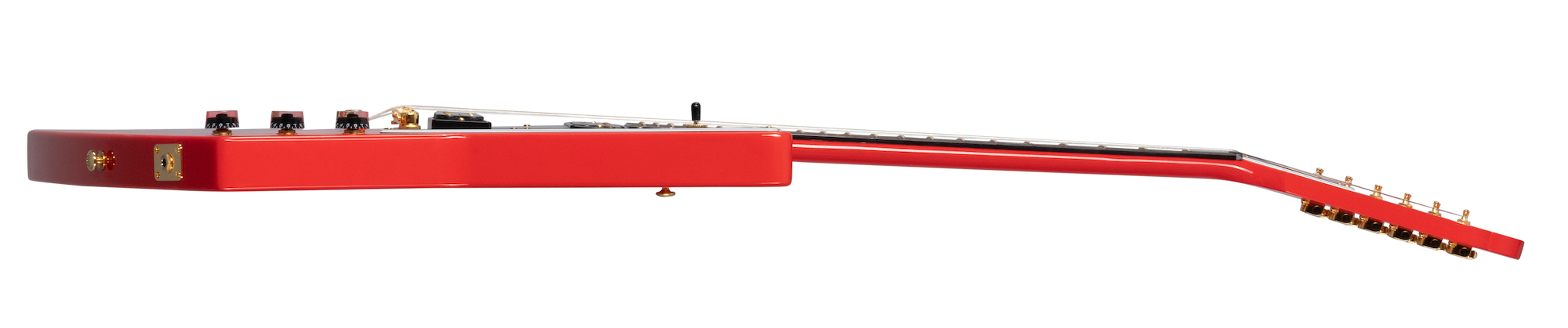 Den dype Cardinal Red-finishen matches med gjennomført gullfarget hardware, inkludert bånd, skruer og elementdetaljer. De to 70s Tribute-pickupene gir et kraftig, rockefokusert uttrykk, mens SlimTaper-halsen sikrer rask og responsiv spillbarhet. Gitaren leveres i et robust Modern Series hardshell-etui.