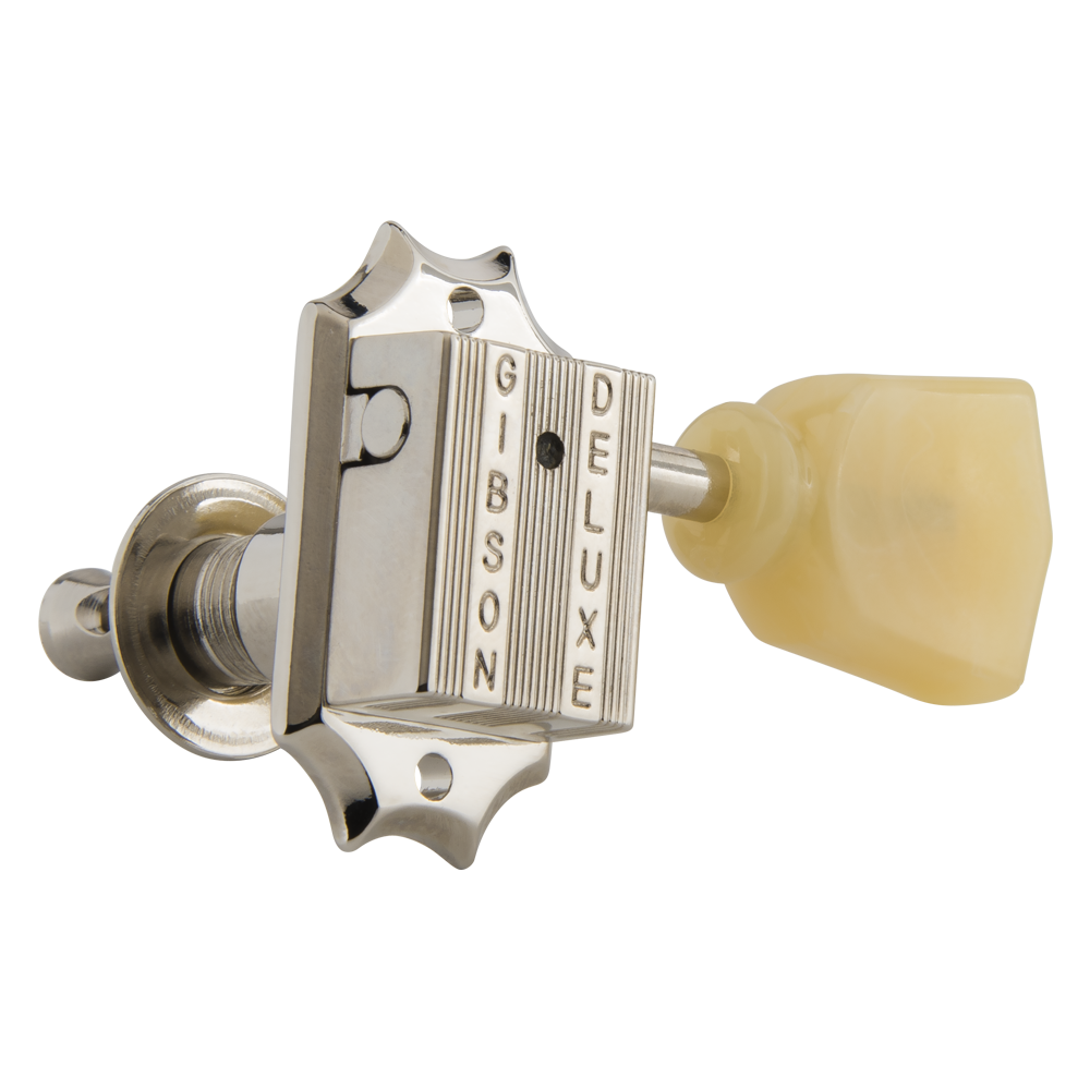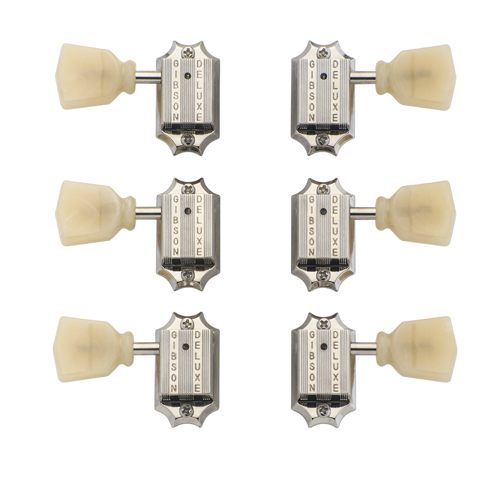 Gibson’s vintage machine heads with pearloid buttons feature solid Nickel, closed housing construction, period-correct vintage styling, and traditional pearloid buttons that deliver precise tuning, while adding a luxurious, classic feel to your guitar’s headstock. This OEM part comes in a Nickel finish. 14:1 Tuning Ratio. Special note: These tuners feature screw in bushings, which require a larger diameter mounting hole than traditional ‘push in’ bushing tuners.