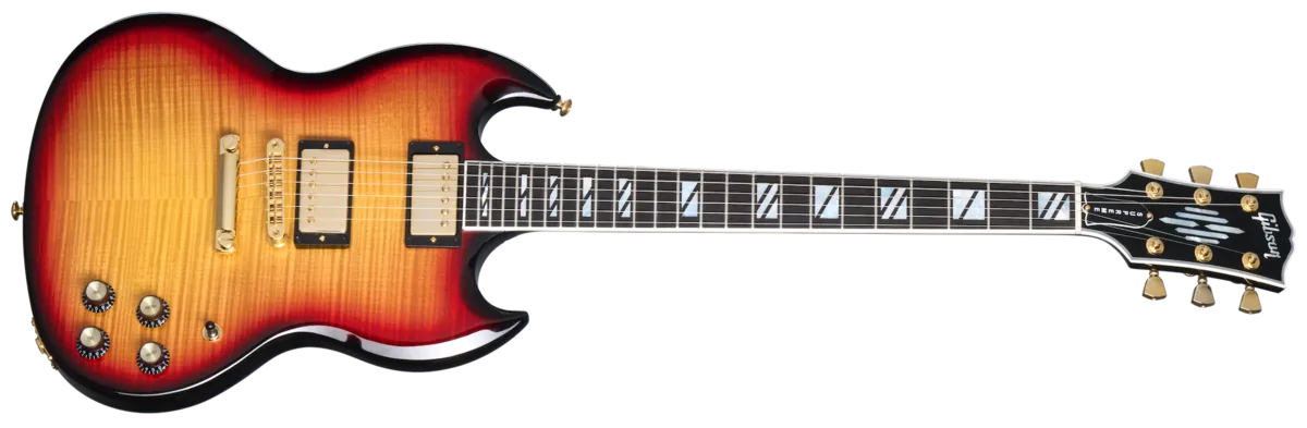 Gibson SG Supreme er en luksuriøs videreføring av en rockelegende – klassisk SG-karakter kombinert med moderne presisjon og eksklusivt uttrykk.