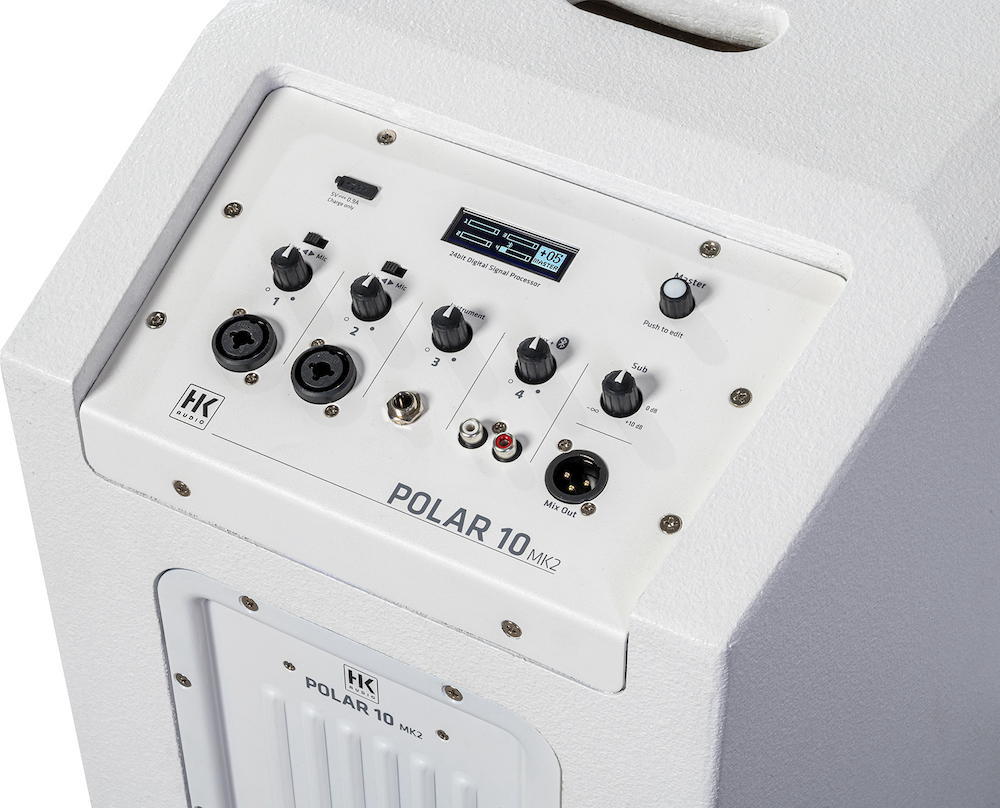 Innebygd 4-kanals mikser gir tilkobling for mikrofoner, instrumenter og linjesignaler, med støtte for kondensatormikrofoner via fantommating. Bluetooth TWS gir mulighet for trådløs stereoparing av to POLAR MK2-systemer. USB-C-port lar deg lade mobile enheter direkte fra høyttaleren.