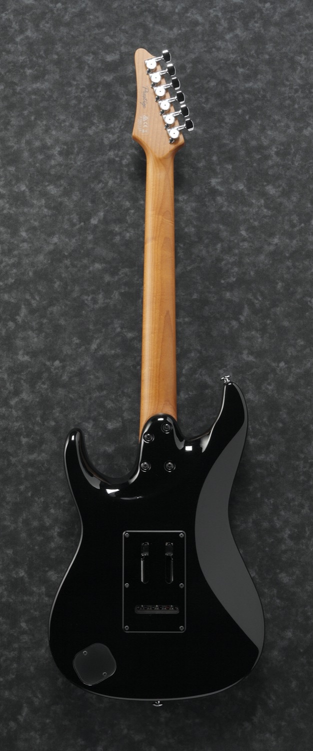 AZ2204B-BK. (Black) Prestige. Made in Japan.AZ - Players Player Project -AZ er resultatet av flere års testing, med mange av verdens beste gitarister som testpiloter, med det formål om å produsere den ultimate Players Player gitaren. Altså et ekstremt vellydende, lettspilt og stabilt instrument som man kan spille praktisk talt alle musikkstiler på. Stekt/bakte lønnehalser for å gjøre den stabil uansett hvor du turnerer på planeten og uansett hvor du spiller. Bånd i rustfritt stål for å gjøre dem nesten uslitelige og for at de skal føles glatte og velpussede uansett hvor mye du spiller. En perfekt fungerende stol med et vib.arm feste som ikke glipper uansett hvor mye du sliter og drar i vib.armen. Og alt dette med ordet TONE som førsteprioritet. Ingen spesifikasjoner i verden betyr noe om det ikke høres fantastisk ut, og det gjør dette, det høres bedre ut enn fantastisk.Serien er tilgjengelig i to versjoner med hals med 24 eller 22 bånd.24 båndversjoner med HH pickup-konfigurasjon og 22 med HSS.AZ halsen er en moderne hals med det Ibanez kaller den ovale C-profilen. En 1 bits Prestige hals i S-TECH behandlet lønn. S-TECH er nitrogen-varmebehandling av treverket og er en videreutvikling av det som vanligvis kalles stekt/bakt trevirke. Noe som på norsk kort sagt betyr at treverket gjennomgår en varmebehandling i en nitrogenfylt oppvarmingsprosess for å fjerne vann og harpiks fra treverket. Det gjør treverket lett, stabilt, holdbart og fullstendig upåvirket av endringer i fuktighet. Treverket blir også vanntett og trenger derfor ikke lakkeres. Disse egenskapene gjør at halsen er ekstremt resonant, har lav fysisk vekt og mye sustain (de samme egenskapene som virkelig godt, gammelt trevirke noen ganger kan ha). En tydelig tone med uovertruffen toneseperasjon. Gitaren synger på en helt annen måte enn tilsvarende ubehandlet trevirke og er flere hundre ganger mer stabil. Halsen er til slutt behandlet med olje som gir gitaren en godt innspilt trefølelse. Glem den klissete lakken man sitter fast i.Specs:• AZ Oval CS-TECH wood roasted Maple 1 pc neck.• 22 frets.• S-TECH wood roasted Maple fretboard w/black dot inlay.• Super All Access Neck Joint.• Luminescent side dot inlay.• Jumbo Stainless steel frets w/Prestige Fret Edge Treatement.• Alder body• Ibanez T1802 tremolo bridge /Titanium saddles (Gotoh)• Gotoh ® Magnum Lock machine heads w/H.A.P.• Seymour Duncan Hyperion (S) neck pickup.• Seymour Duncan Hyperion (S) mid. pickup.• Seymour Duncan Hyperion (H) bridge pickup.• dyna-MIX 9 switching system w/Alter switch.• Bone saddle• Chrome hardware.• Hardcase• 648mm/25.5 scale.