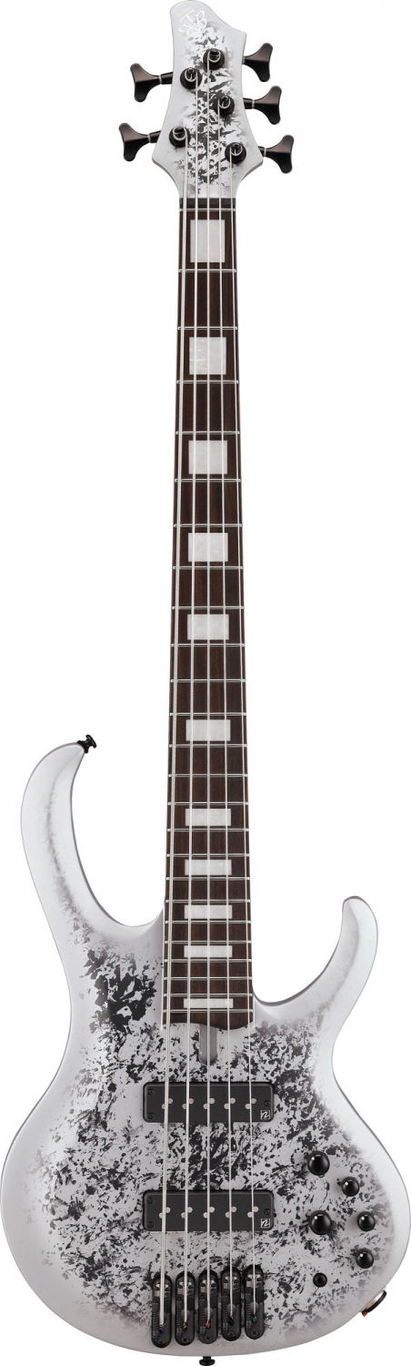 Ibanez 25th Anniversary BTB 5-strengs El-bass – BTB25TH5-SLM. Silver Stamp.BTB Premium serien kan best beskrives som serieproduserte boutiquebasser og i 2024 feirer serien 25 år og et par jubileumsmodeller presenteres.BTB er ekstremt vellydende og velbalanserte instrumenter med imponerende egenskaper. Den litt lengre skalaen på halsen gjør bassene perfekte for kvinter og sekster der den lave B får en helt annen sprett og fasthet av denlitt lengre 35'' skala. Forskjellen på 2,5 cm (1 ) ser kanskje ikke så mye ut på papiret, og det føles ikke så mye forskjellig å spille på, men forskjellen i tone er stor. Tonene får en helt annen spenst, stramhet og artikulasjon enn på en kortere skala. Spesielt på lave toner er forskjellen virkelig verdt den lille ekstra strekningen av fingrene. Det lange øvre hornet gjør at bassen, til tross for den litt lengre halsen, er perfekt balansert enten du sitter eller står opp og spiller. Spiller du 5-, 6-strengs eller tuner ned, er lengre skala noe du bare må prøve, du vil definitivt ikke angre. Pickupene er Nordstrand Big Single, balanserte klare, varme dual-coil pickuper med en fast og stram bass og en full og åpen mellomtone. Bridgen er Ibanez Mono-Rail V, en bridge designet for å isolere strengene fra hverandre. Isolasjonen gir optimal overføring av strengens vibrasjoner ned i kroppen uten at strengene påvirker hverandre. En stabil og veldig lettjusterbar bridge.