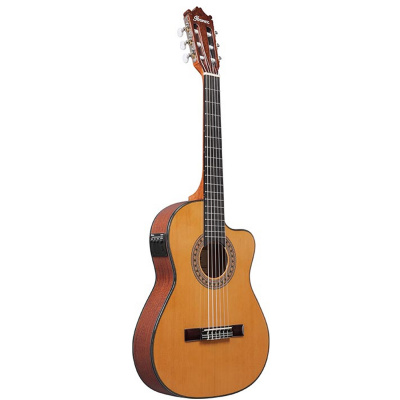 GA5CE3Q-AM er en elektrifisert klassisk gitar i 3/4 størrelse, med en litt tynnere kropp og smalere hals (46 mm) ved sadelen.