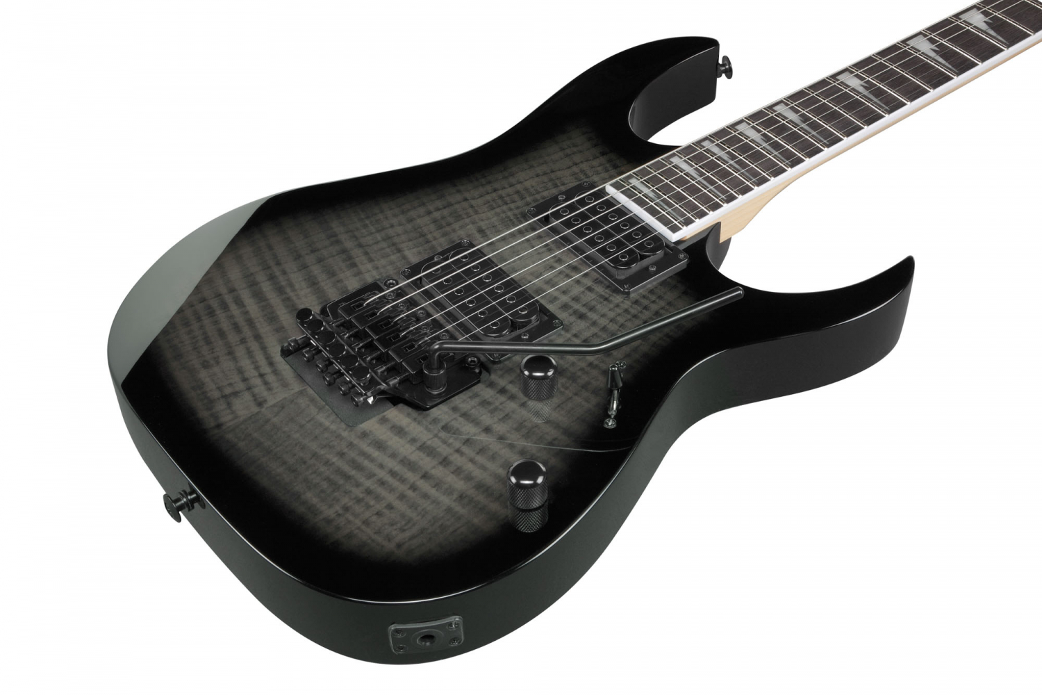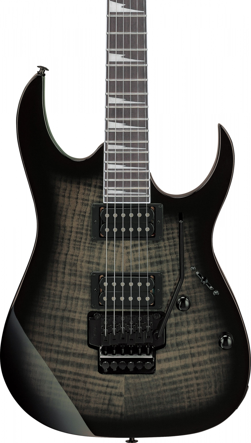 GRG320FA har en kropp av poppel, lønnehals med innbundet gripebrett av Purpleheart, Infinity-pickups og et låsbart tremolostall.