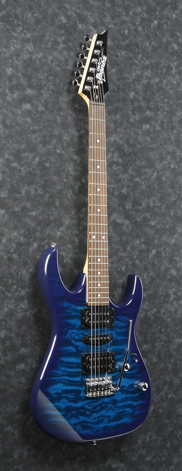 GRX70QA-TBB (Transparent Blue Burst).GRX serien tilbyr den berømte RG elegansen, komforten, tonen og spillbarheten. Ikke bare ser og spiller GRX bedre enn alt annet i deres prisklasse, deres strenge inspeksjon og oppsett er det samme som på Ibanez sine dyrere modeller.Spec:• GRX maple neck.• Treated New zealand Pine fretboard w/ White dot inlägg.• Poplar body w/Quilted Maple Art Grain top.• Medium frets.• T106 tremolo.• Infinity R (H) neck pickup.• Infinity RS (S) mid. pickup.• Infinity R (H) bridge pickup.• Chrome hardware.Neck:• Scale: 648mm/25.5 .• Width at Nut: 42mm.• Width at Last Fret: 56mm.• Thickness at 1st: 19.5mm.• Thickness at 12th: 21.5mm.• Radius: 400mmR.