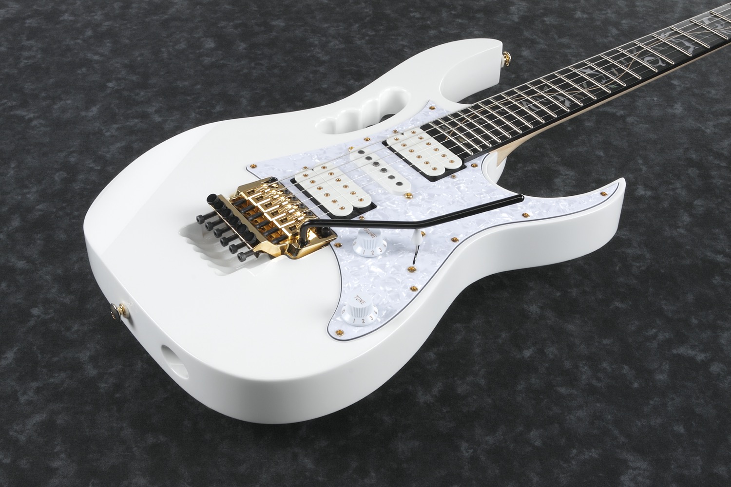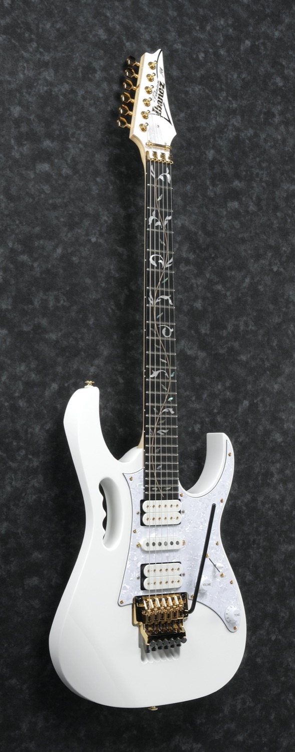 JEM7VP-WH Steve Vai signatur, Premium.JEM er en signaturmodell der verken gitaren eller gitaristen bak trenger noen presentasjon overhodet. Det er rett og slett ingenting å si om noen av dem som ikke alle allerede vet. En mer personlig og stilbyggende signaturmodell er vanskelig å finne. Hver eneste lille funksjon på gitaren er helt etter Steve sitt hode og 100% slik han vil ha gitarene sine. Har du sett Steve spille etter 1987 noen gang, så er det en JEM han har spilt på. En mer trofast bruker av sin egen signaturmodell har sannsynligvis aldri eksistert. Og gitarverdenen har svart med en høylytt og rungende vi vil ha den samme gitaren som deg, Steve! . JEM-modellen er mildt sagt blitt en makeløs suksess. Og det er ikke rart, alt ved gitaren er helt toppklasse og så god som en gitar kan være. Med en fantastisk bredde og uovertruffen spillbarhet, er det en gitar for mange flere gitarister enn bare Steve Vai freaks. Uansett hva du spiller, kan du få lyden du leter etter i en JEM.Specs.• 5-pc maple/walnut Wizard neck with KTS Titanium rods.• Alder body.• Ebony fretboard withTree of Life inlägg.• Jumbo frets w/Premium fret edge treatment.• Ibanez original EDGE tremolo.• DiMarzio Evolution (H) Neck PU.• DiMarzio Evolution (S) Middle PU.• DiMarzio Evolution (H) Bridge PU.• Gold hardware.• Gigbag included.Neck:• Scale: 648mm/25.5 .• At nut: 43mm.• At last fret: 58mm.• Thickness at 1F: 18mm.• Thickness at 12F: 20mm.• Radius: 400mmR.