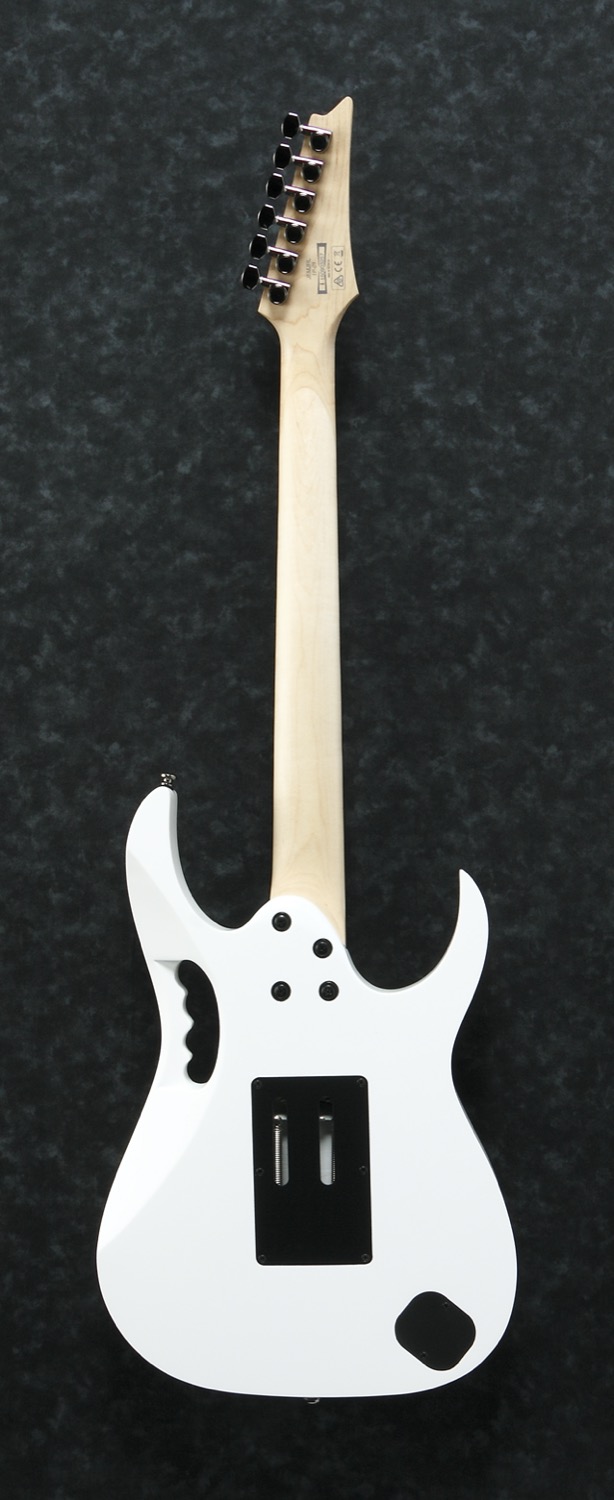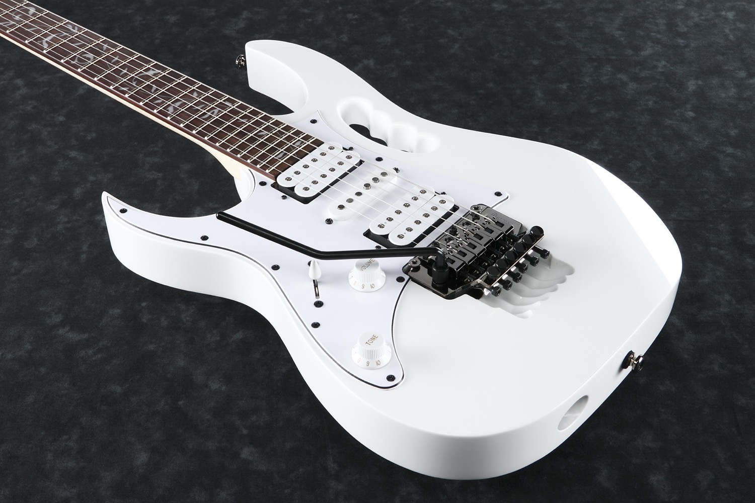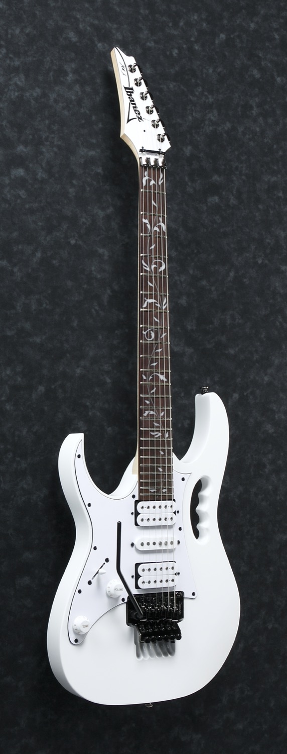 JEMJRL-WH (White) Steve Vai signature.En signaturmodell hvor hverken gitaren eller gitaristen behøver noen presentasjon i det hele tatt. Det finnes, helt enkelt, ingenting å si om noen av dem som ikke allerede alle vet. En mer personlig og stilskapende signaturmodell er vanskelig å finne. Hver eneste lille funksjon på gitaren er helt etter Steves eget hode og 100% slik som han vil ha sine gitarer. Har man sett Steve spille noen gang, noe sted, siden 1987, så er det en JEM han har spilt på. En mere trofast bruker av sin signaturmodell finnes nok ikke. JEMJRSP er akkurat vad det høres ut som. En lillebror til Steves JEM777. En spesifikasjonsmessig nedskalert versjon av sin langt dyrere storebror. Enklere hardware, pickuper og innlegg, gjør at man kan holde prisen lav men samtidig tilby en ekte JEM på både følelse og utseende.Specs:• 3-pc Wizard maple neck.• Jatoba fretboard.• Vine inlay.• Jumbo frets.• Mahogny body.• Double Locking tremolo.• Quantum Neck PU.• Quantum Middle PU.• Quantum Bridge PU.• Cosmo black hardware.Neck:• Scale 648mm/25.5 • Width at Nut 43mm• Width at Last Fret 58mm• Thickness at 1st 19mm• Thickness at 12th 21mm• Radius 400mmR