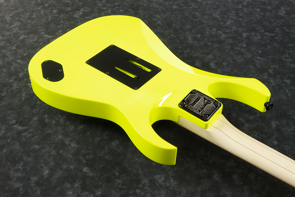 RG550L-DY (Desert Yellow) RG Genesis Collection, Japan. Lefthand. RG, flaggskipet i Ibanez sitt gitarsortiment og uten tvil den modellen de er mest kjent for. RG står for, på smart japansk maner, Rock Guitar og et mer passende navn på en gitarmodell har sannsynligvis aldri eksistert. RG er utvilsomt den ultimate rockegitaren. En gitar som startet en skole for hvordan en rockegitar skulle se ut og utstyres. Egenskaper som ekstremt lettspilte og raske halser, heftig cut-away for tilgang til de høyeste båndene, tremolo som er innfelt i kroppen og holder stemmingen selv når du trykker til, og mikrofonkombinasjoner med mange lydmuligheter osv. er det alle forventer at en rockegitar skal ha etter at RG-modellen kom ut på markedet. Men RG er også så mye mer enn bare en rock. I 25 år har det vært førstevalget for gitarister som ønsker spillbarhet, pålitelighet og bredde i et instrument av høyeste kvalitet. En gitar som takler hva du bruker den til og som kan være med på popjobb om morgenen, en jazzjobb ved lunsjtid og fusion musikk i studio, mens du venter på at dansebandstudiojobben skal begynne før du drar på kveldens metall jobb for deretter å fortsette til en røykfylt bluesjam ut i de små morgentimene. Uansett hva du spiller, vil gitaren levere det du trenger. Til tross for modellens enorme suksess, har Ibanez ikke slått seg til ro, men fortsetter å utvikle modeller kontinuerlig med alt fra titanforsterkede halser, forskjellige tre- og mikrofonkombinasjoner, nye og bedre stoler, flere strenger, lengre halser og forskjellige halsprofiler. Utvikling skjer på alle modeller fra de enkleste til de absolutt verste modellene, så de går foran uansett hvilken prisgruppe du ser på. Ofte låner en lavere modell noe av en høyere og bedre serie, og bedre ting klatrer lenger og lenger ned i serien. RG er utvilsomt en modell som har lagt moderne klassiker bak seg og er med god margin kvalifisert på listen over gitarklassikere. Spec: • Super Wizard 5 pcs Maple/Walnut neck. • Tilt Neck joint with Ibanez logo plate. • Basswood body. • Jumbo frets. • Maple fretboard w/Black dot inlay. • Edge tremolo bridge. • Ibanez V7 (H) neck pickup. • Ibanez S1 (S) mid pickup. • Ibanez V8 (H) bridge pickup. • Black hardware. • Finish: Desert Yellow. Passande etui: W200C Passande bag: Ibanez IGB521-BK. Neck: • Scale: 648mm/25.5 . • Width at Nut: 43mm. • Width at Last Fret: 58mm. • Thickness at 1st: 17mm. • Thickness at 12th: 19mm. • Radius: 430mmR.