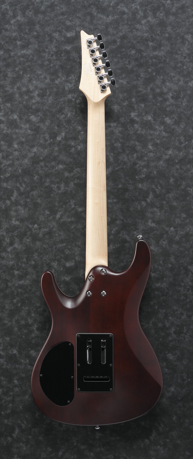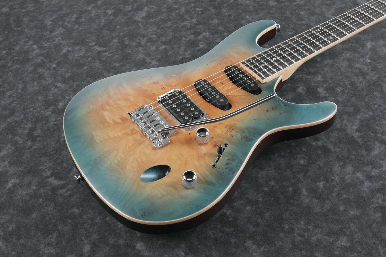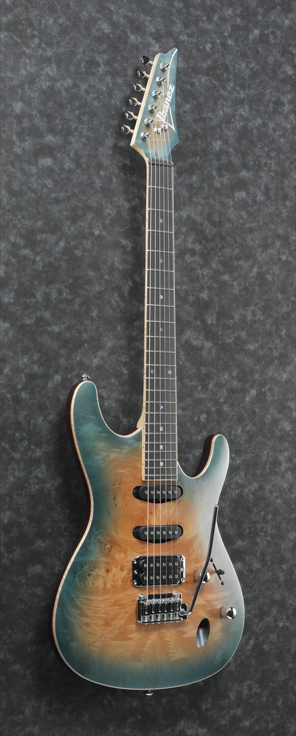 SA460MBW-SUB (Sunset Blue Burst).SA-modellen er som en mellomting mellom en S-modell og en normalt tykk gitar med buet topp (arched topp). En rundere og mykere skåret gitar enn den kantete RG-modellen. Med tykkere og rundere (mer C-formede) halser, to-punkts ikke-låsbar stol og True-duo humbucker i stolen med single-coil mikrofoner neck og middle, er det en gitar som snakker et mer tradisjonelt språk enn mye annet i Ibanez sitt sortiment. Modellen er en ekte lydkameleon som lett takler alt fra myk pop til metall.Spesifikasjoner