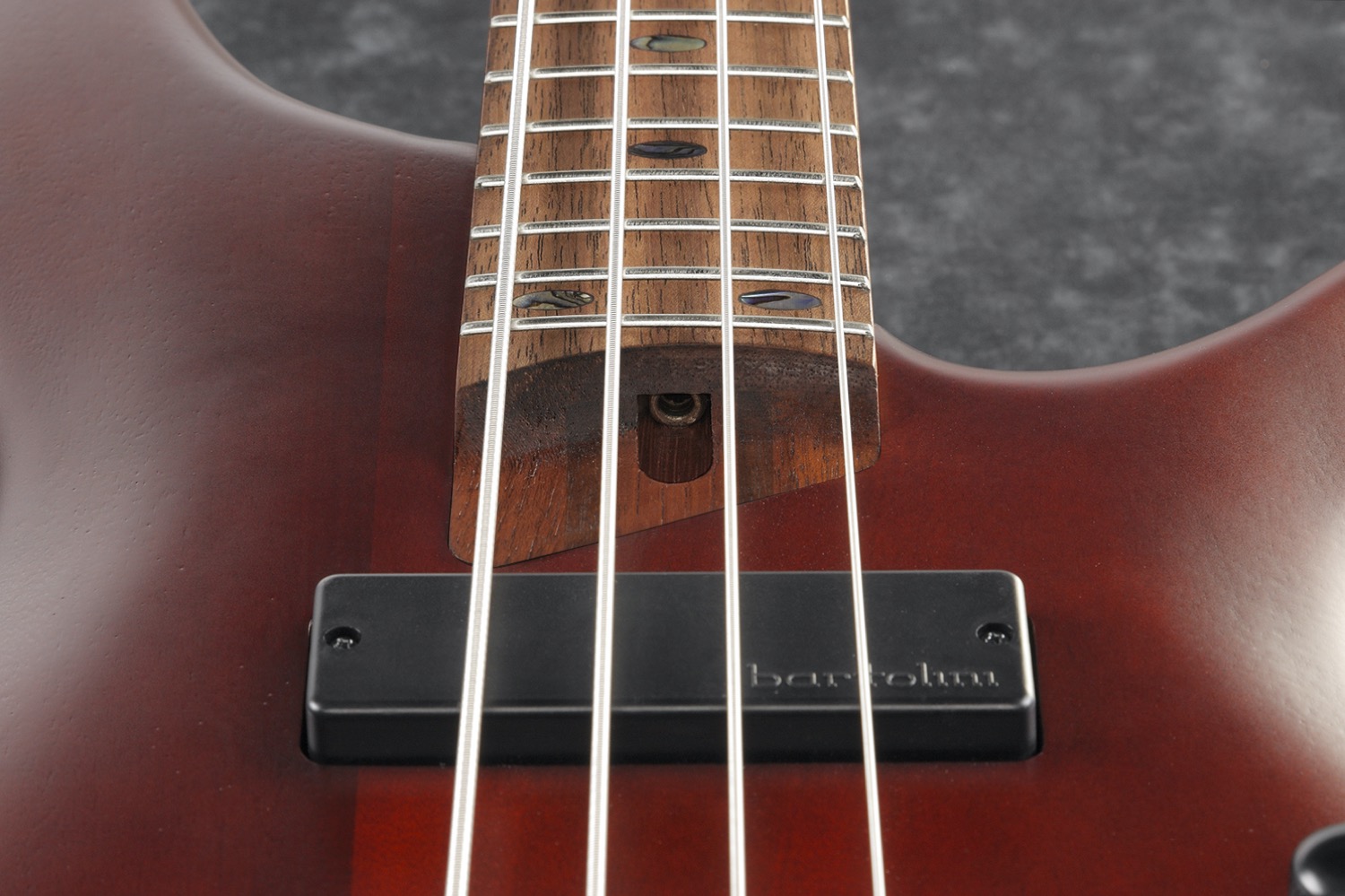SR500E-BM (Brown Mahogany). SR er sannsynligvis den bassmodellen de fleste tenker på når noen sier Ibanez bass , og i omtrent 25 år har det vært den markedsledende modellen blant small body -basser (basser med mindre, slanke, kropper). Dette er lette, lettspilte basser som er ekstremt behagelige å ha på seg og å spille på. Perfekt for folk som spiller ofte eller har lange spillejobber. SR finnes i tilgjengelige modeller fra billige innstegsbasser til absolutte verstingbasser og alt midt i mellom. Uansett hvilken prisklasse du vil legge deg på, så finnes det en SR bass for deg. De er også tilgjengelige i flere forskjellige tresorter og pickupkonfigurasjoner. Spec: • 5-pc Jatoba/Walnut SR4 neck. • Jatoba fretboard w/Abalone oval inlays. • 24 medium frets. • Okoume body. • Ibanez Accu-cast B500 bridge. • Bartolini® BH2 neck pickup. • Bartolini® BH2 bridge pickup. • Ibanez Custom Electronics 3-band EQ w/EQ bypass switch. (passive tone control on treble pot) & 3-way Mid. • Black Matte hardware. Neck: • 864mm/34 Scale. • 38mm Width at nut. • 62mm Width at last fret. • 19.5mm Thickness at 1F. • 21.5mm Thickness at 12F. • 305mmR radius.