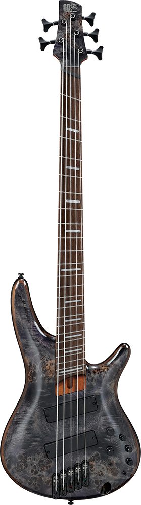 SRMS805-DTW (Deep Twilight) Bass Workshop SRM er en serie SR basser utstyrt med fanned frets, som er en metode for å kunne ha forskjellige strengelengde på forskjellige strenger, såkalt multi-scale fingerbrett. Dette gjøres blant annet for å få optimal skalalengde for alle strenger. Tykke strenger låter mye bedre, fastere, strammere og spenstigere , med en lengre skala, mens de tynne strengene blir harde og svært vanskeligspilte med en så lang skala tykke strenger trenger. Fanned frets, multi-scale er løsningen på dette. Tette og stabile mørke toner og lyse som beholder sin snap og varme. SRMS805 er et instrument som inngår i Ibanez Bass Workshop serie. Ibanez Bass Workshop er en bassavdeling hos Ibanez som jobber under mottoet From Concept To Reality , hvor målet er å utvikle nye og spennende basskonsepter. Eller for å teste allerede eksisterende, men odde konsepter. Her vil du finne instrumenter som tar elbassen et steg videre, rariteter fylt med friske ideer for de som ønsker å ta sitt basspill en (eller tre) skritt videre. Hvis du vil finne standardbasser, er ikke dette stedet å lete på. Bassen er utstyrt med en videreutviklet versjon av Ibanez mono-rail stol, nå kalt MR5S (tidligere versjon heter IV). Den stolen er utformet for å muliggjøre et større spekter av intoneringsmulighetene enn den forrige versjonen IV hadde. I det hele tatt, enda flere oppsetts muligheter av bassen. Alt dette mens det har blitt mye lettere å håndtere. Mono-rail har også den fordel at den isolerer vibrasjonene fra strengen fra hverandre og gir renere nyanser med lengre sustain. Basisen er basert på Ibanez SR bass, trolig den bassmodellen de fleste tenker på når noen sier Ibanez bass. SR har i 30 år vært den markedsledende modellen blant Small Body basser (basser med mindre, slankere kropp) i verden. Det er lette, lettspillende basser som er svært behagelig å ha hengende på seg og å spille på. Perfekt for folk som spiller mye eller har lange spilleøkter. SR er tilgjengelig i modeller fra de billige nybegynnerbassener til absolutte monster basser og alt imellom. Uansett hvilken prisklasse du ønsker å legge deg på, så er det en SR bass for deg. De kommer også i flere forskjellige tresorter og pickup konfigurasjoner. Specs: • SRMS5, 5-delt Jatoba/Walnut Multi-scale hals. • 901.7mm (35,5 ) skala på femte streng, 864mm (34 ) på første. • Panga Panga gripebrett. • 24 medium frets. • Poplar Burl topp på en Walnut/Mahogany kropp. • Bartolini BH2 halspickup (passive). • Bartolini BH2 stolpickup (passiv). • Ibanez Electronics Custom 3-bånd EQ m/EQ bypass bryter & Mid frequency bryter. • Mono-Rail V stol. • Matt svart hardware. Anbefalt etui: SCEBR, W100SR. Anbefalt bag: Ibanez ISBB501 Hals: • 901.7mm / 35.5 - 864mm / 34 skala • 45 mm bred ved sadelen. • 68 mm bred ved siste bånd. • 19,5 mm tykk ved første bånd. • 23mm tykk ved tolvte bånd. • 305mmR radius.
