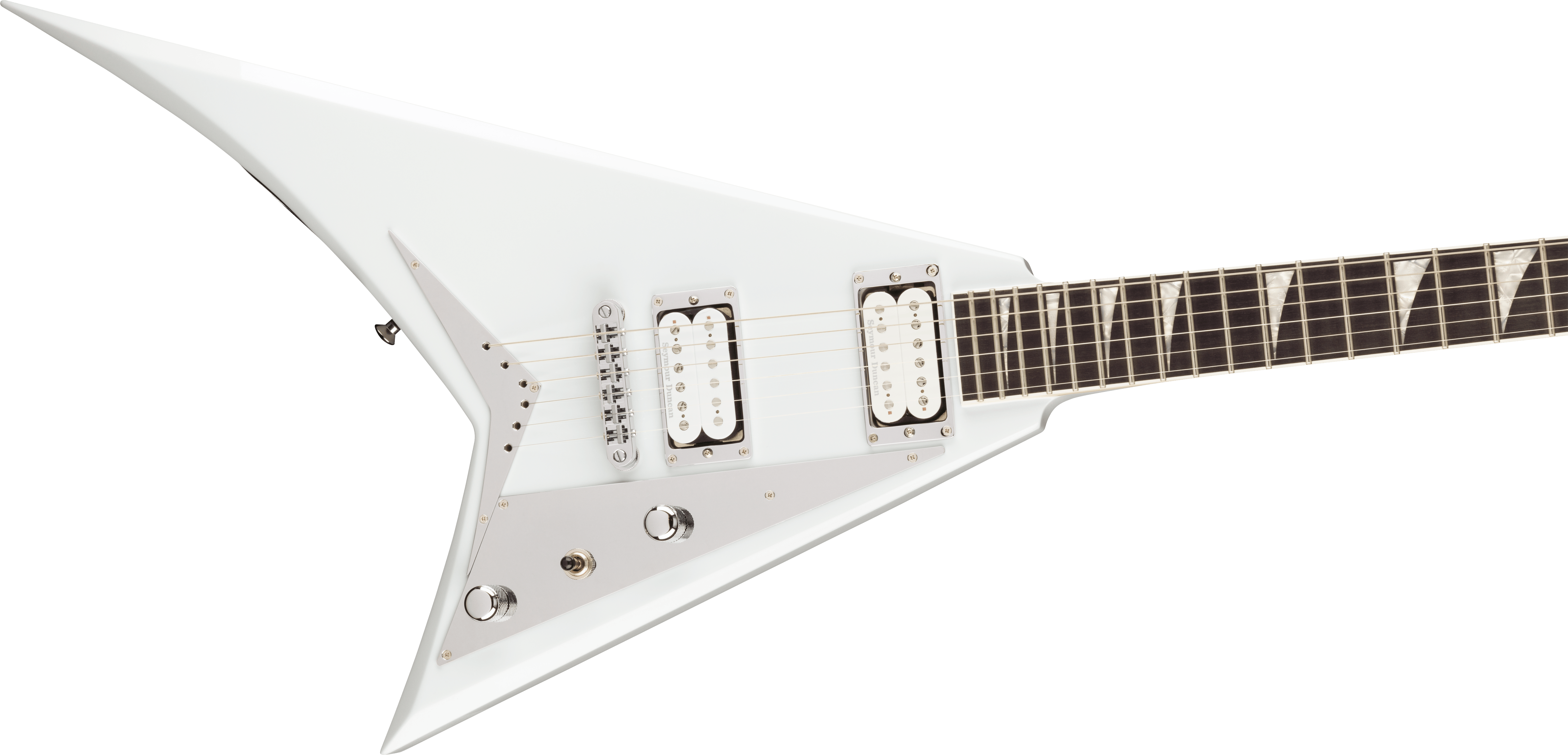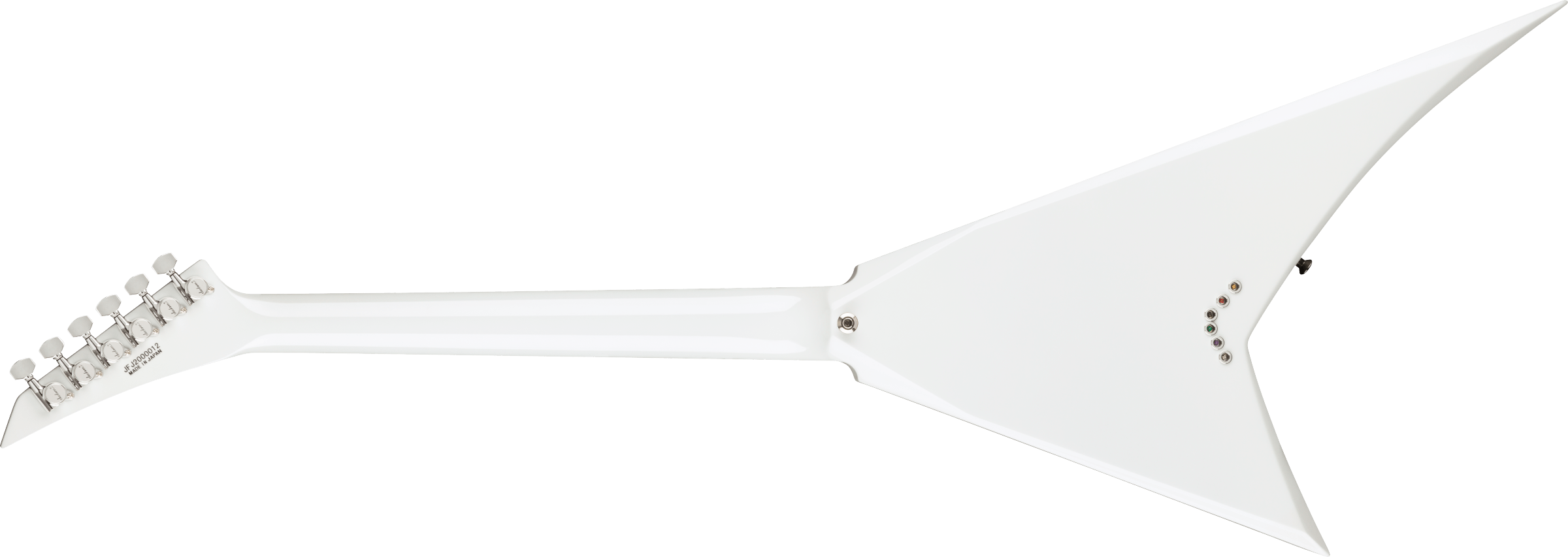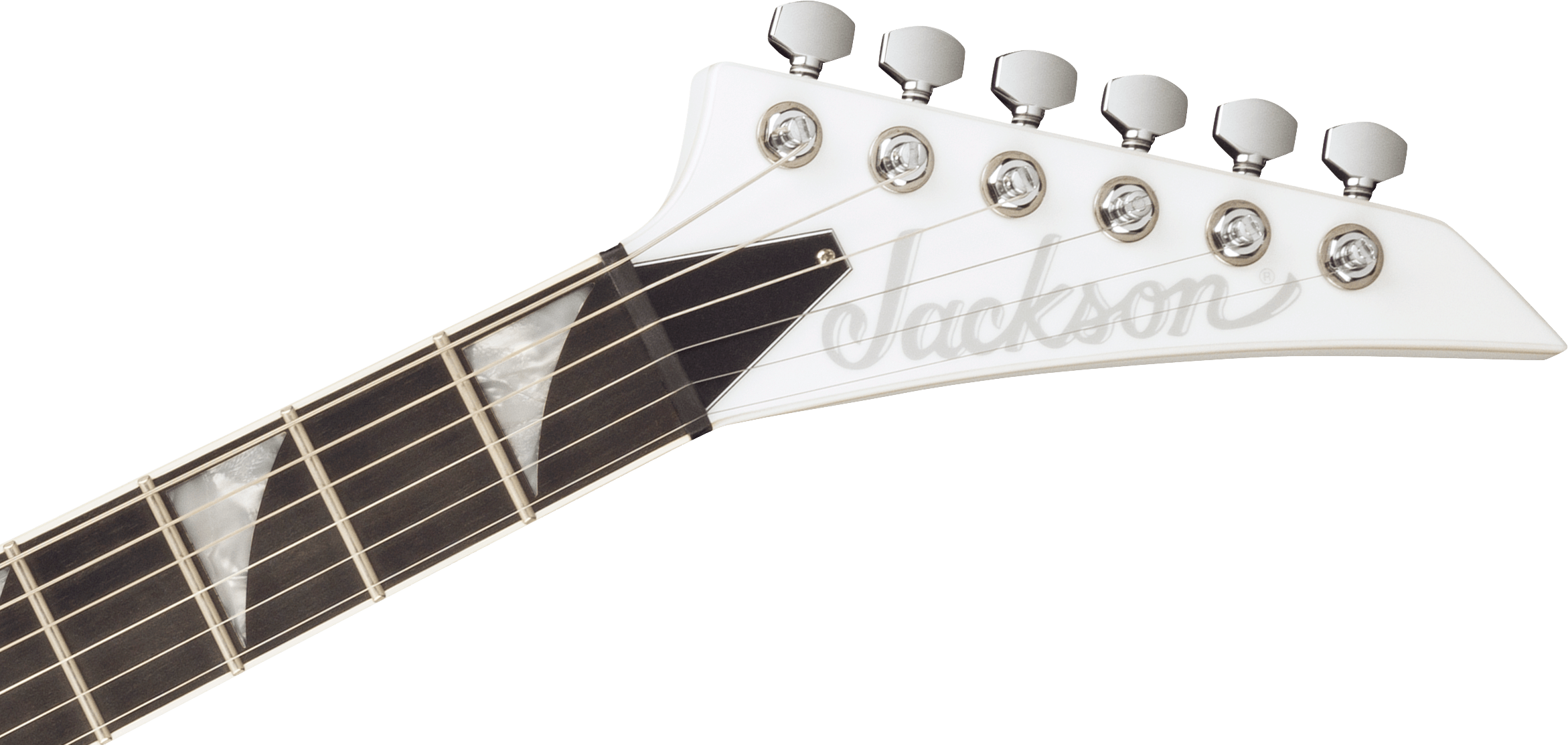 The MJ Series Rhoads RRT boasts classic metal style in a Snow White finish with white pointy headstock, chrome pickguard and chrome hardware.