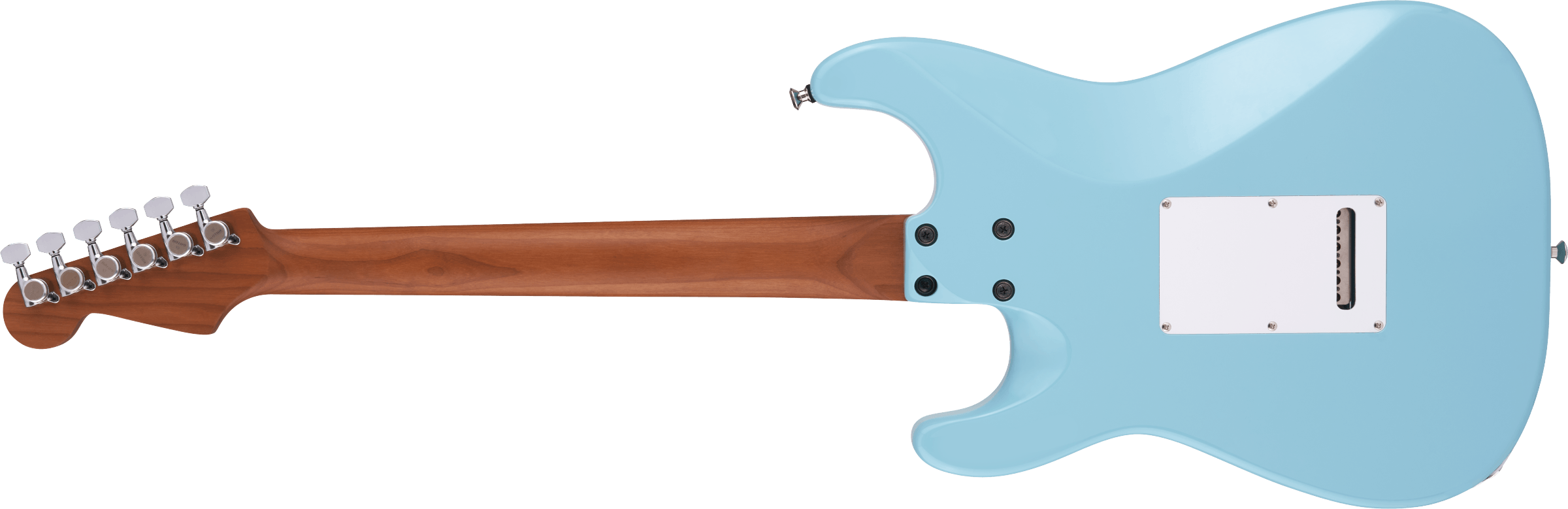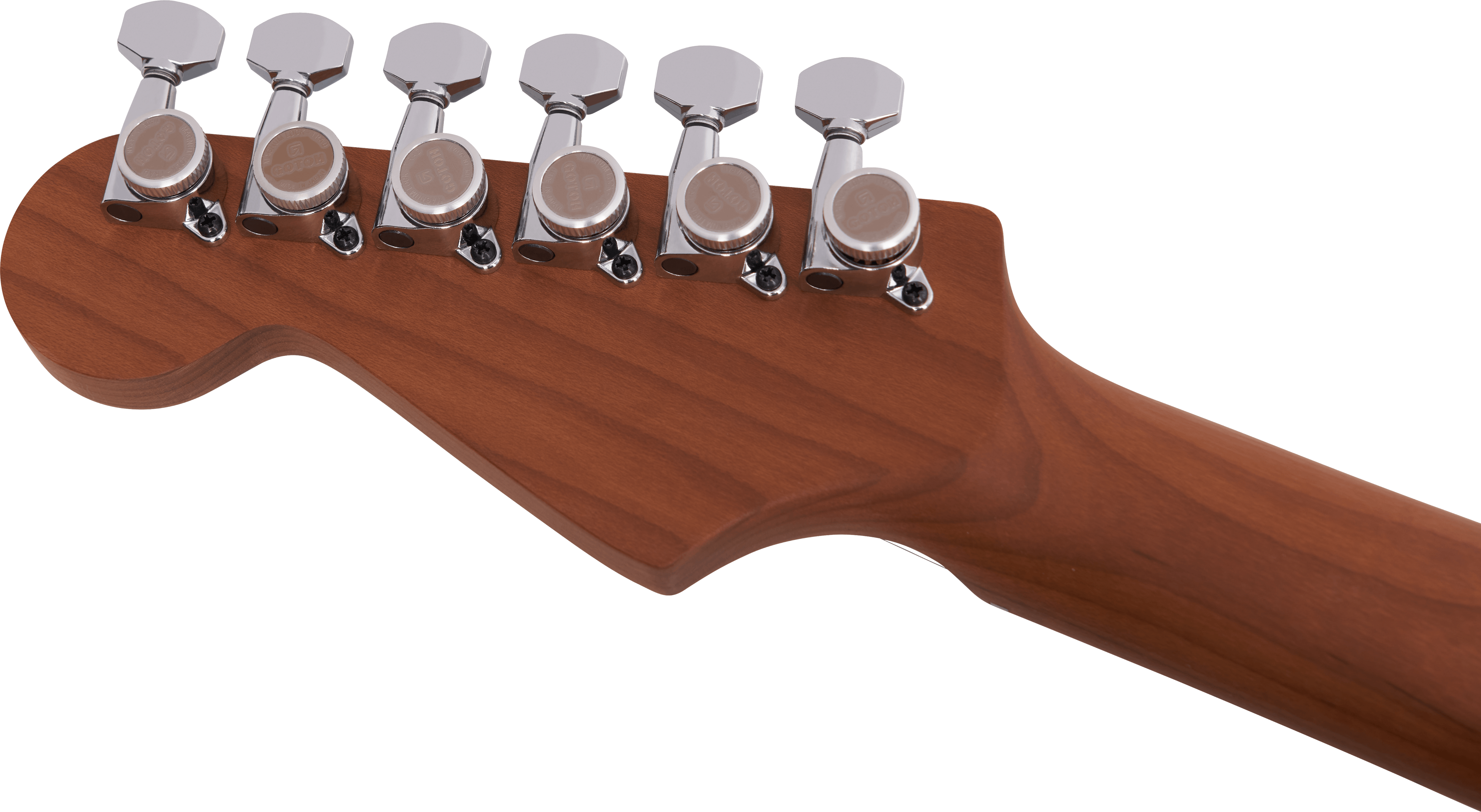 Gotoh Custom 510 tremolosystem, Graph Tech TUSQ XL-sadel og Gotoh die-cast locking stemmeskruer er valgt for jevn tremolobruk og god stemmestabilitet. Instrumentet leveres i Daphne Blue med fargematchet Licensed Fender Stratocaster-headstock, hvitt plekterbrett, parchment detaljer og chrome hardware.