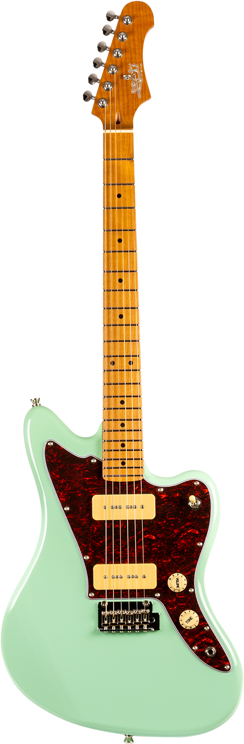 JJ-300 P90 er utstyrt med P90-pickups som leverer en tydelig, artikulert tone med god dynamikk og karakter. Kontrolloppsettet består av én volumkontroll, én tonekontroll og en 3-veis pickup-bryter, som gir enkel og effektiv tilgang til gitarens klangmuligheter. Fast bro og solid hardware i krom bidrar til pålitelig intonasjon og stabilitet.